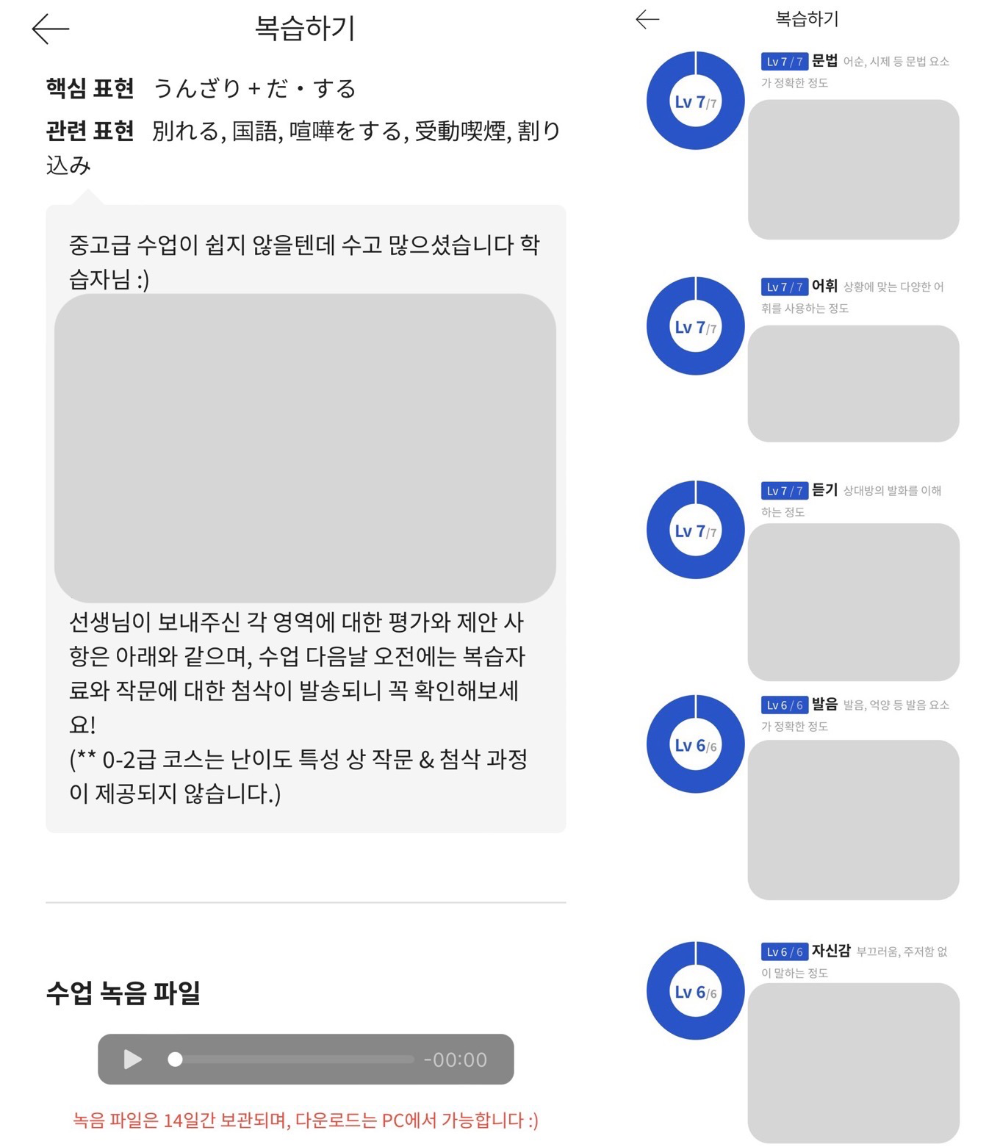'복습'에서는 수업에서 나온 표현의 요약과 전체적인 수업 평가 결과, 문법, 어휘, 듣기, 발음, 자신감 5가지 항목 세부 평가를 보여주고, 예습과 같이 게임 형태로 수업에서 배운 내용을 복습할 수 있었다. 수업 녹음본도 다운로드할 수 있어서 내가 어떤 식으로 말하는지 다시 들어볼 수 있는 점이 좋았다.