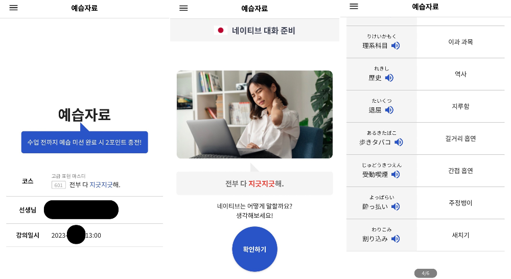 1:1 수업을 시작하기 전까지 '예습'을 할 수 있는데, 수업 내용에 대한 문장과 단어들을 게임 형식으로 미리 학습하는 단계다. 총 6페이지 정도가 있었고 한 3분 정도가 걸렸다. 수업시작 한 5분 전에 부담 없이 간단하게 보고 수업을 시작할 수 있게 만들어둔 느낌?