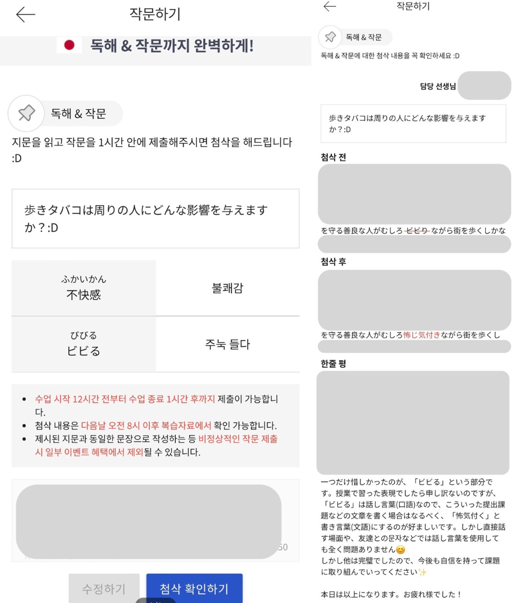 수업이 끝난 뒤에는 '작문'과 '복습'을 할 수 있었는데, 먼저 작문은 오늘 수업에 나왔던 주제에 대해서 250자 정도로 짧게 작문을 하면 된다. 내 작문 주제는 수업 중에 나왔던 길거리 흡연에 대한 내용이었다. 길거리 흡연은 주위 사람들에서 어떤 영향을 끼칠까요?라는 주제로 내 생각을 일본어로 써서 제출하면 된다. 이때 밑에 관련 단어를 몇 개 제안해 주는데, 이 단어를 넣어서 작문을 하라는 건가 싶었다. 아무튼 작문을 해서 제출하면 원어민 선생님이 작문 내용에 대해서 피드백을 주신다. 참고로 피드백을 주시는 선생님은 수업하신 분과는 다른 분이었다. 안내엔 피드백은 다음날 오전 8시 이후에 확인할 수 있다고 되어있었는데, 나는 거의 바로 피드백이 달려서 깜짝 놀랐다. 한 한 시간? 도 안 걸려서 피드백이 온 듯.