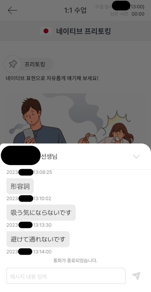 그렇게 먼저 앱 화면을 보면서 수업을 쭉 진행해 나갔는데, 수업을 하면서 일본어로 말할 때 좀 어색한 표현을 한다거나 잘못된 표현을 하면 바로바로 더 자연스러운 표현으로 고쳐주셨고, 채팅으로도 남겨주셔서 나중에 복습하기에 좋았다. 선생님이 수업을 하면서 자연스럽게 짚어주시는 것도 좋았지만 개인적으로는 표현이나 발음, 억양이 이상한 것 같으면 이거 괜찮았냐고 바로 되물어볼 수 있었던 게 굉장히 도움이 되었다.