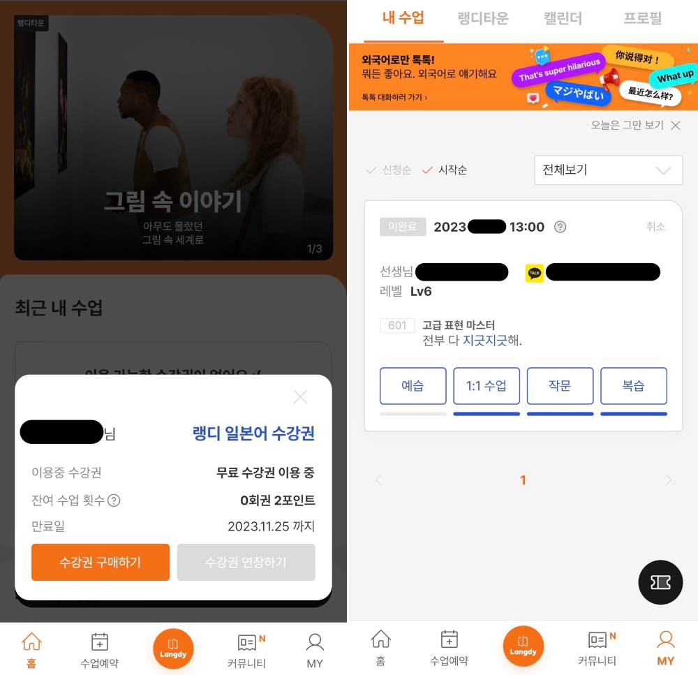 수업을 예약하면 MY탭에서 예약한 수업 정보를 볼 수가 있다. 선생님은 모두 원어민 선생님들인 것 같고, 무료 수업 주제는 정해져 있는 게 있는 듯하다. (내가 선택하거나 하지는 않았음)