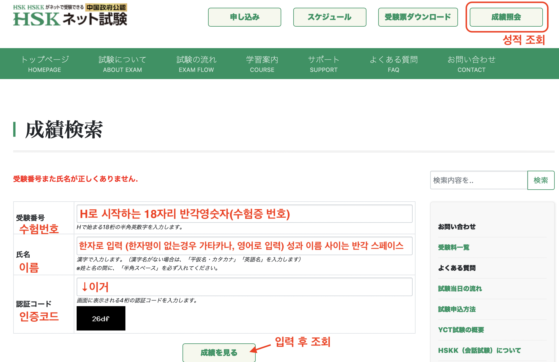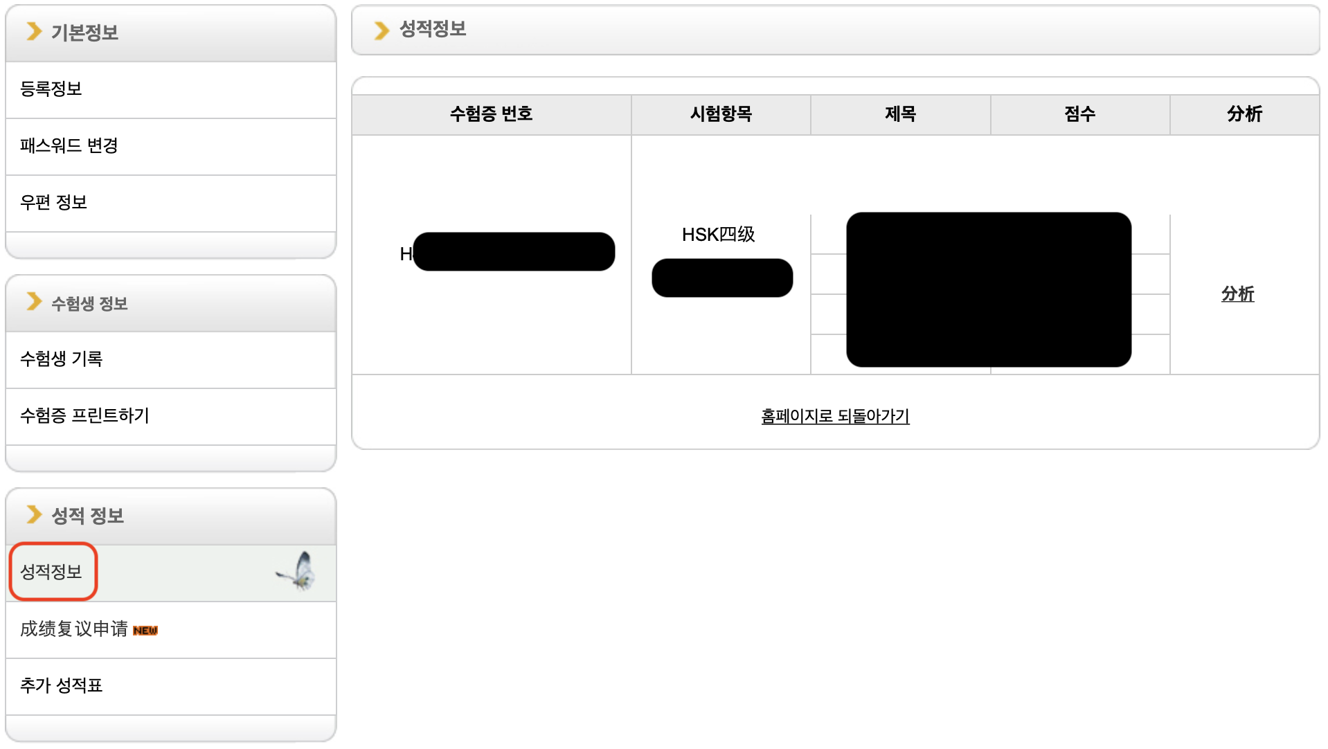 성적 발표일은 시험 스케줄 페이지에서 확인 가능하다. 성적 발표일이 되면 성적 조회 페이지에 들어가서 수험번호와 이름, 인증번호를 입력하면 성적 조회를 할 수 있다. 그리고 3에서 말했듯 「汉语考试服务网」사이트에서도 성적조회가 가능하다.
