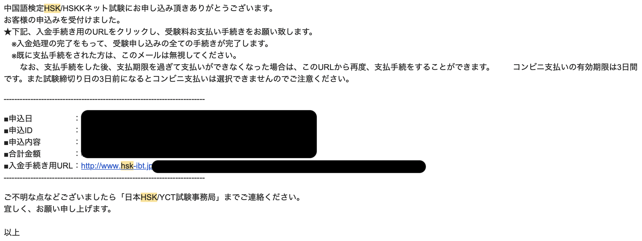 정보 등록을 마치면 등록한 메일로 아래의 이미지처럼 접수 확인 및 수험료 결제 안내 메일이 날아온다. 안내대로 입금 수속 URL로 들어가 수험료를 지불하면 된다. 편의점 지불 등 방법은 여러 가지가 있으나 지금 기억이 안 나고, 나는 신용카드로 결제를 했다. 수험료 진짜 너무... 비싸다. 이걸 그냥 한 번 봐볼 생각을 했다니 돈 아까운 줄 몰랐던 미련한 어린날의 나 자신이여... 결제가 수리되면 금방 결제 확인 메일이 도착하는데, 이러면 시험 접수는 미션 완료인 거다. 이제 시험일까지 공부를 하며 기다리자.