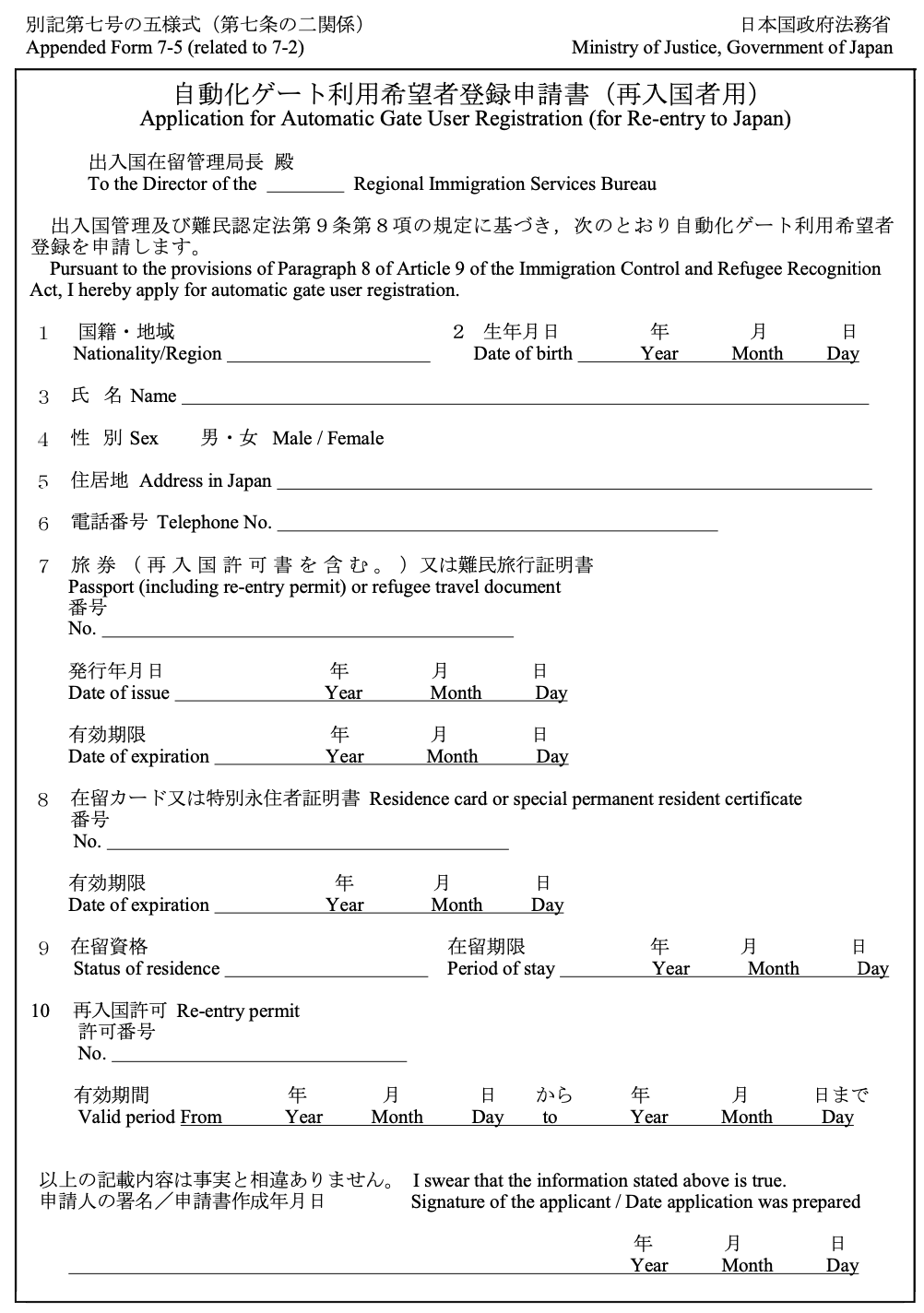 자동화 게이트 이용 신청서는 두 종류가 있는데, 하나는 일본인용 다른 하나는 일본에 재류하는 외국인용(재입국자용)이다. 일본 국적이 아닌 사람은 외국인용 신청서를 쓰면 된다. 인터넷에서 이하와 같은 신청 양식을 다운로드(링크) 받을 수 있으니 미리 작성해 가도 되지만, 신청하는 곳에 신청서가 놓여있으니 빈손으로 가서 작성해도 된다.