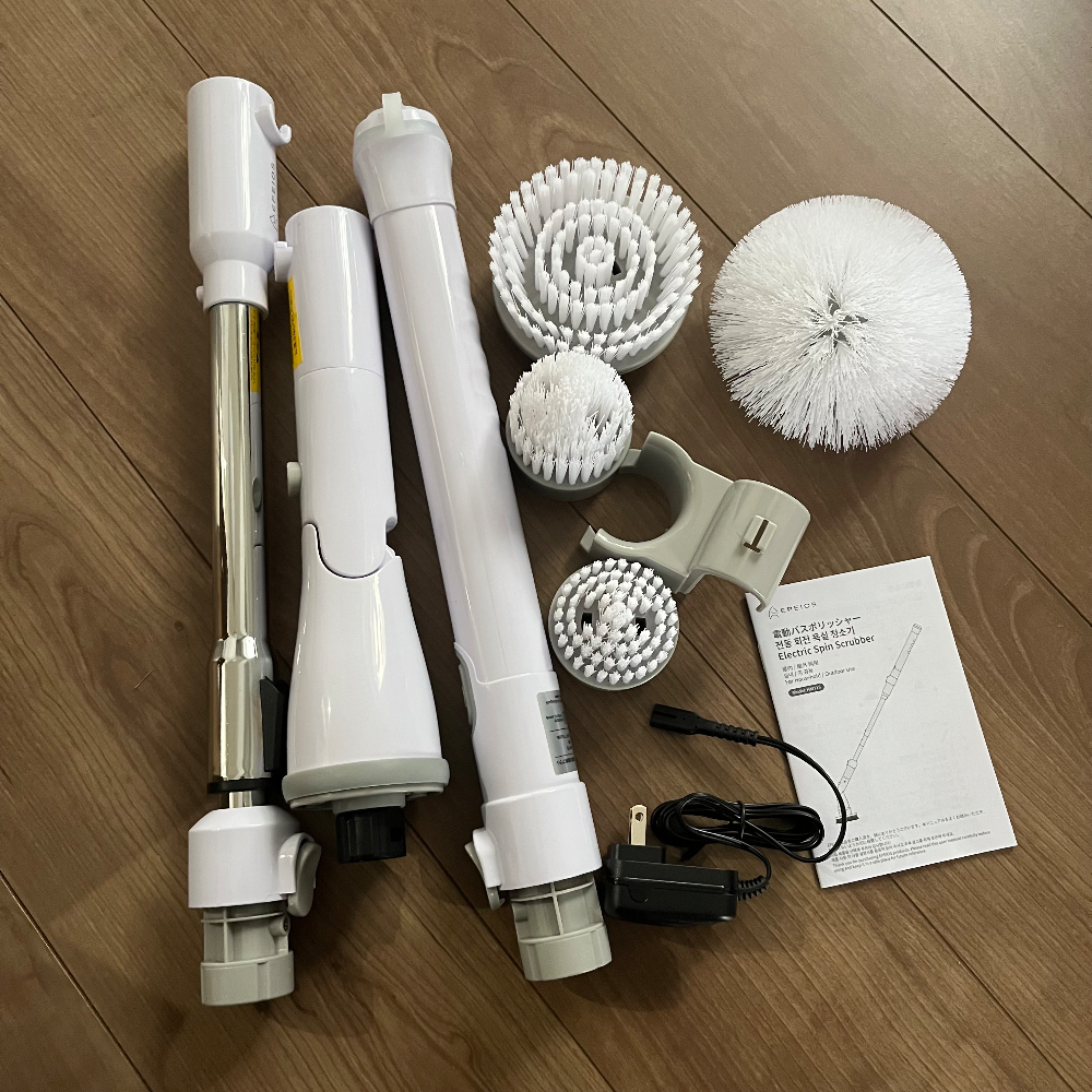 구성품은 본체(3파트)와 브러시 4종, 거치대, 충전기, 설명서로 이루어져 있었다. 브러시 부분을 만져봤는데 생각보다 솔이 너무 단단한 재질이어서 욕조에 흠집이 나는 게 아닐까 싶었는데, 실제로 사용해 보니 그렇지는 않았다. 설명서에 한국어도 제대로 쓰여 있길래 알아봤더니 일본 브랜드이긴 하지만 한국에도 거점을 두고 사업을 하는 기업이라고 한다.