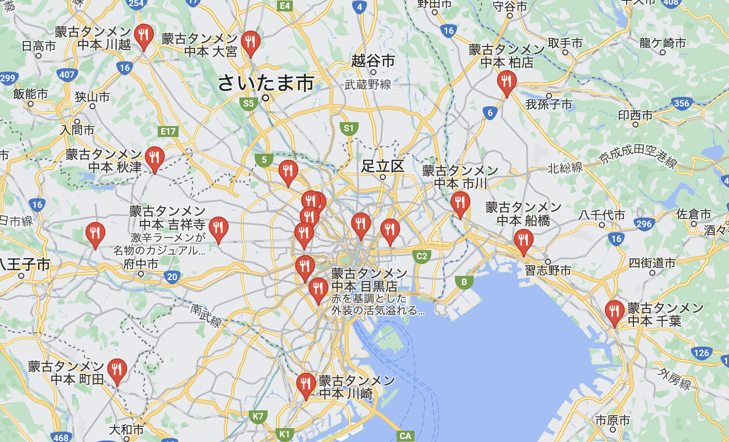 근데 이 라멘집이 일본 와서 매운 걸 먹고 싶은데 매운 건 한국 인스턴트 라멘 정도밖에 없는 비극을 어느 정도 해소시켜준 라멘집이다. 몽고탄멘나카모토(蒙古タンメン中本)라는 미소(일본식 된장) 베이스 라멘 가게이고, 메뉴는 전 메뉴를 잘 정리해 놓은 사이트가 있으니 참고. 간판메뉴는 이름과 같은 몽고탄멘(蒙古タンメン)이지만 체감상 다른 메뉴인 북극 라멘(北極ラーメン)이 더 유명한 것 같다. 북극 라멘이 엄청 매운 라멘(激辛ラーメン)으로 유튜브 같은데에서 많이 네타로 쓰여서 그렇지 싶다. 일본에서 매운 거 좋아하는 사람들이라면 모르는 사람이 없는 가게.