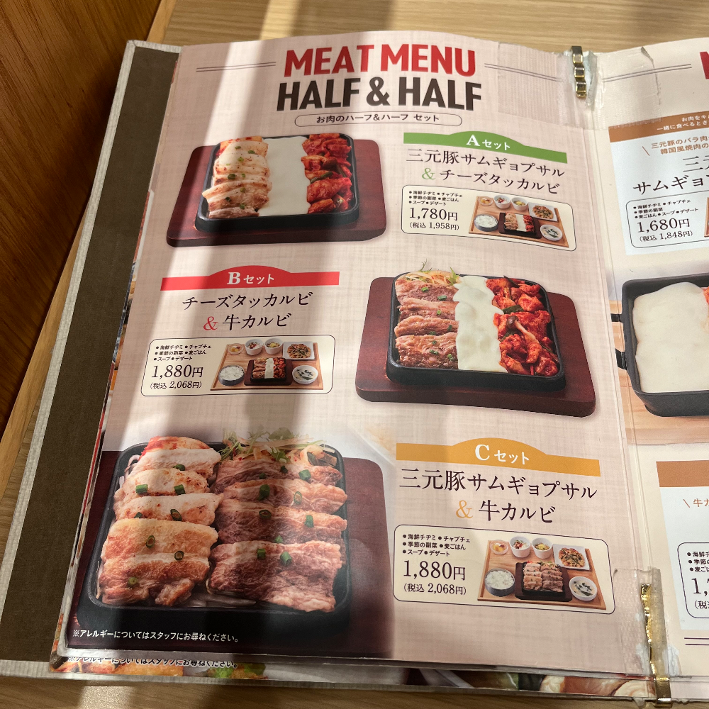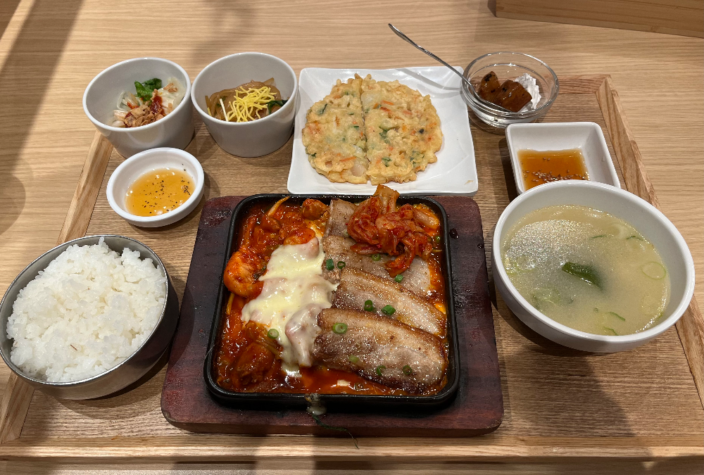 메뉴가 꽤 다양해서 뭘 먹을까 고민하다가 가장 무난해 보이는 반반세트메뉴를 선택. A set인 삼겹살&치즈닭갈비 세트를 시켰다. 메인 요리인 삼겹살&치즈닭갈비와 함께 보리밥, 국, 계절반찬, 잡채, 해물전, 디저트가 세트로 나온다. 가격은 1958엔.