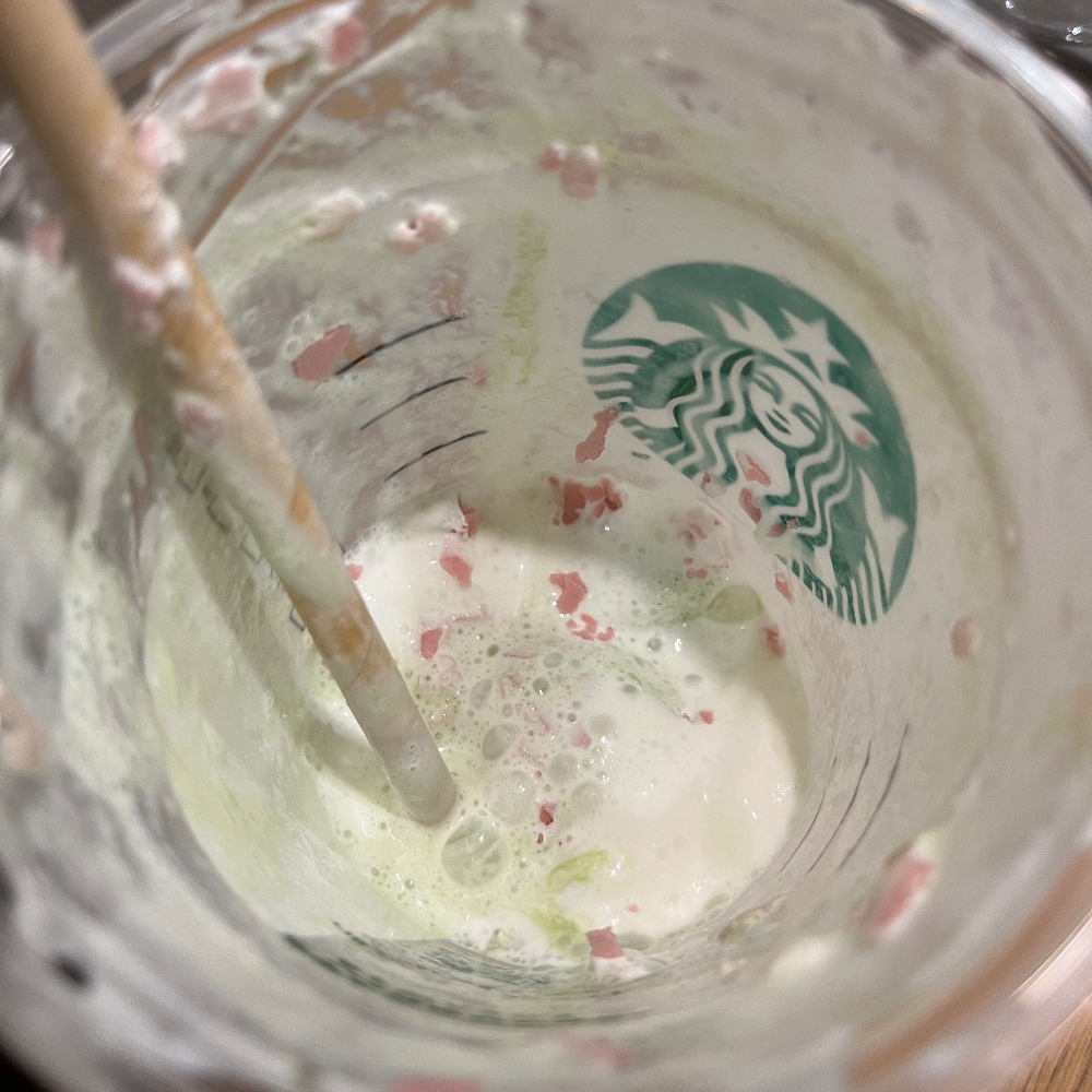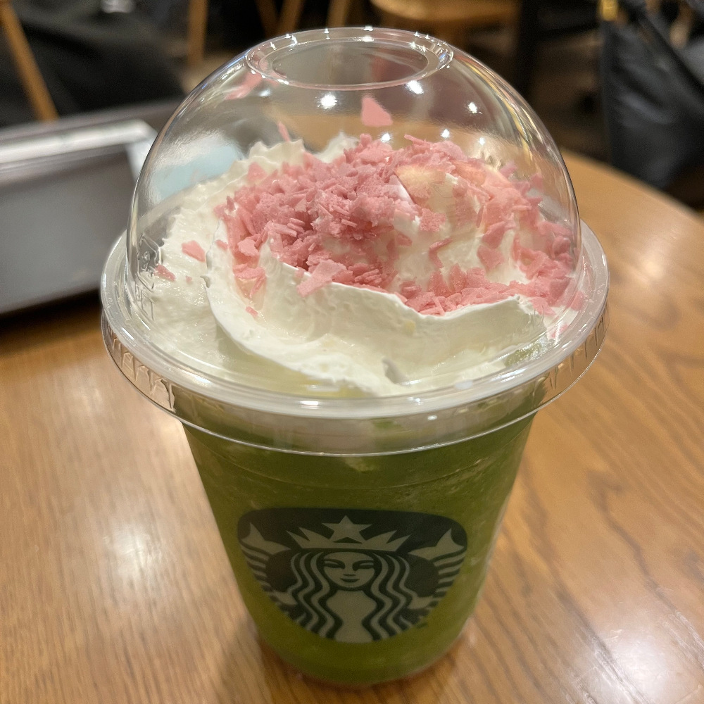 말차 크림 프라푸치노 베이스에 이번 기간한정 음료인 하나미 당고 프라푸치노 (花見だんご フラペチーノ)에 들어가는 사쿠라 앙금 소스랑 스트로베리소스가 밑에 깔리고, 토핑으로 사쿠라 휘앙티누가 올라간 음료인 듯하다. 맛은 그냥 정말 상상한 그대로의 맛이다. 꽃맛이 살짝 나는 말차 크림 프라푸치노.