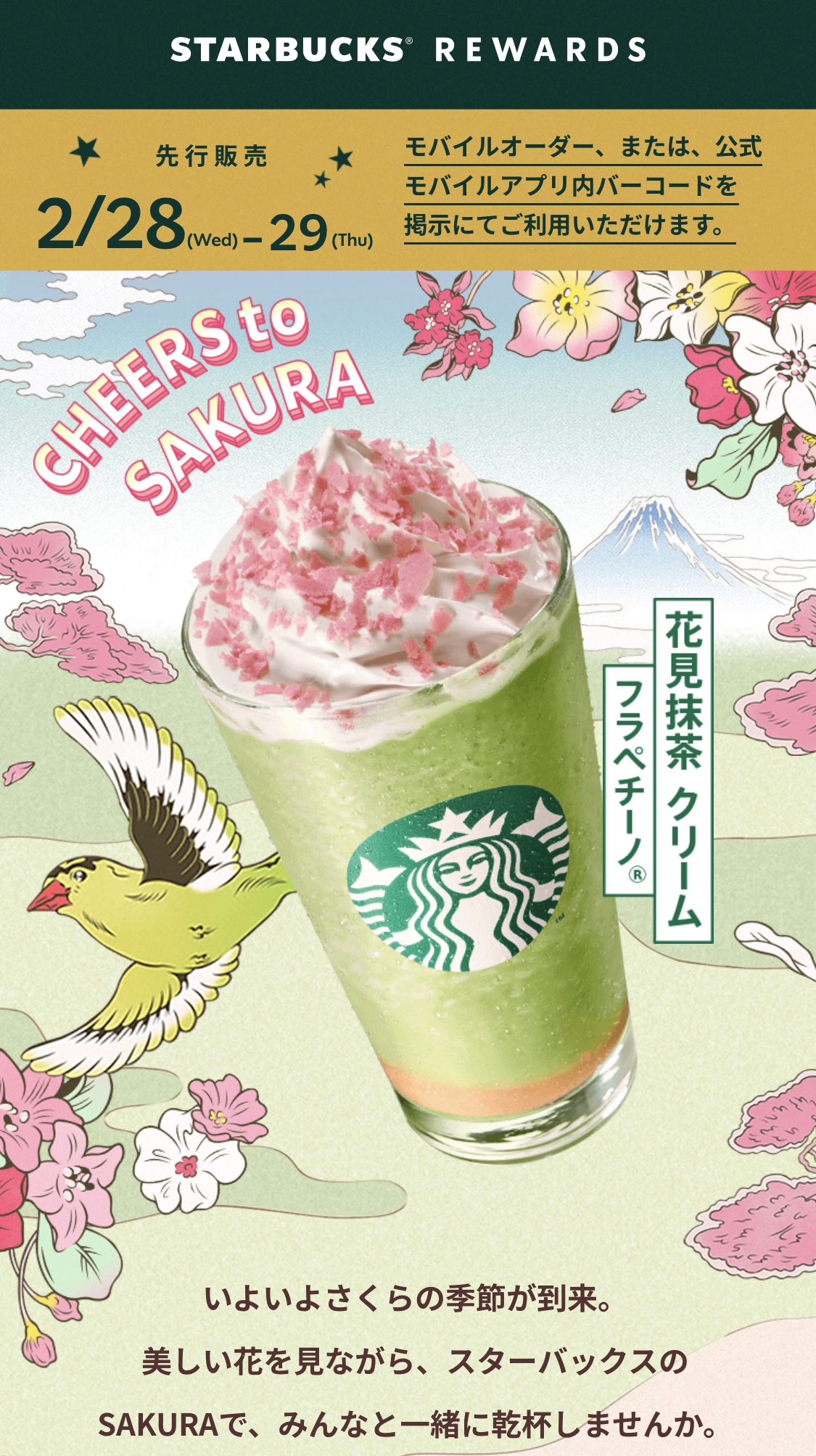 3월 1일부터 판매를 시작하는 시즌한정 어레인지 메뉴인 하나미 말차 크림 프라푸치노 (花見抹茶 クリーム フラペチーノ)가 28일부터 스타벅스 리워드 회원 한정으로 선행판매를 하길래 마셔보았다.