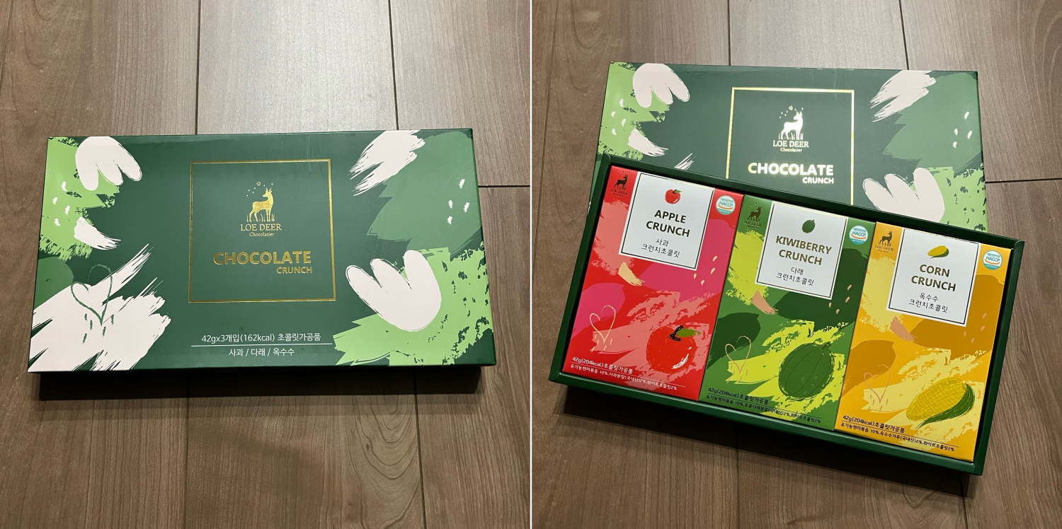 이렇게 포장도 뭔가 허술하게 되어있는데 3종류 (사과, 다래, 옥수수)의 맛이 그렇게 다르지도 않았고, 초콜릿이 아니고 크레파스를 먹는 느낌이었으며 크런치는 굉장히 눅눅했다. 꼭 청소하다가 산지 3년이 지난 초콜릿을 발견해서 먹는 맛이었다. 그래도 음식을 버리면 나중에 지옥에 가서 전부 비벼먹을 수도 있으니 한 3달에 걸쳐서 다 먹긴 했다. 이게 취향에 맞는 사람도 있겠지만 나는 아니었다.