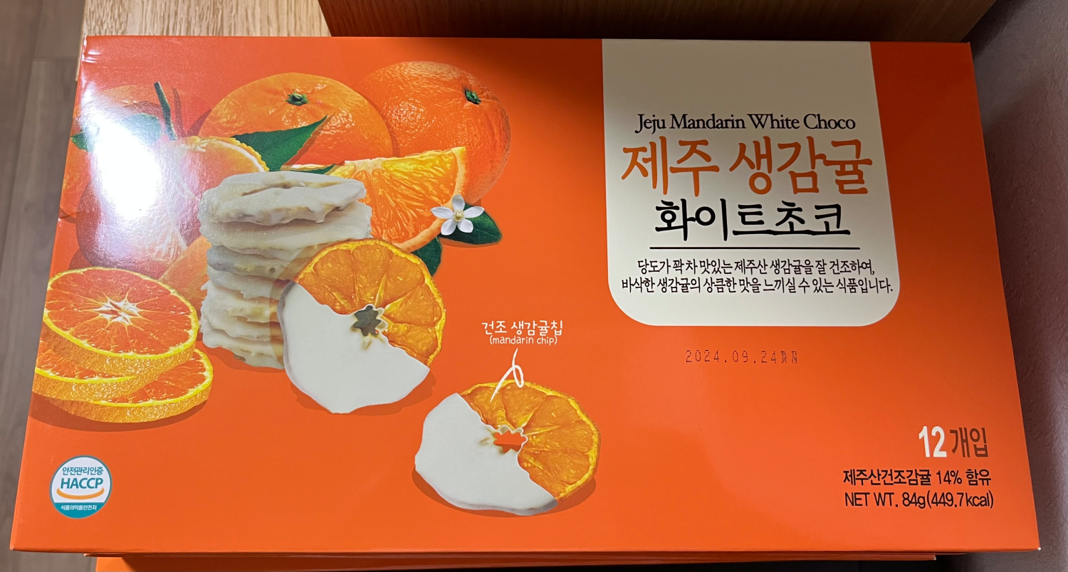 아무튼 직원분 추천으로 구매한 제주 생감귤 화이트 초코는 굉장히 맛있었고 반응도 좋았다. 부서 사람이 그렇게 많지 않아서 3 박스면 충분했기 때문에 한 박스는 내가 꿀꺽했는데, 은은하게 신 말린 감귤에 달달한 초코 조합이라서 생각 없이 먹으면 한 박스를 금방 먹겠더라. 지금까지 먹어본 한국 기념품 중에서 원탑이다.