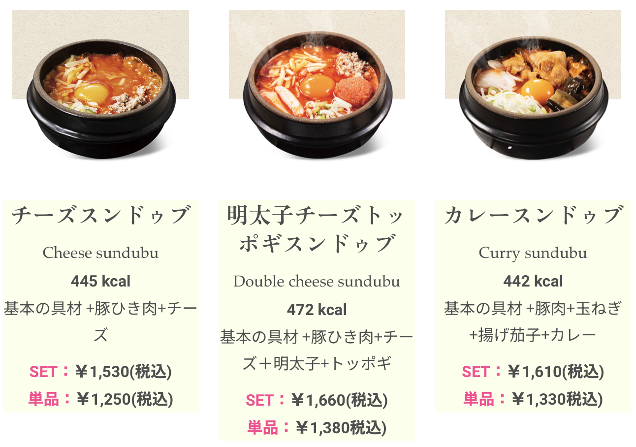 순두부찌개는 일본에서 건강을 챙길 수 있는 헬시한 음식으로 포지셔닝을 하고 있다. 그리고 도쿄순두부같은 순두부찌개 전문점에서는 마라탕 느낌으로다가 순두부찌개에 각종 토핑을 추가할 수 있기 때문에 종류가 엄청나게 다양하다. 도쿄순두부의 메뉴를 보면 "명란젓 치즈 떡볶이 순부두"같은 환장스러운 순두부 찌개 메뉴도 있는데, 이게 바로 2번에서 언급한 떡볶이를 떡볶이 떡으로 지칭한 사례라고 할 수 있다.
