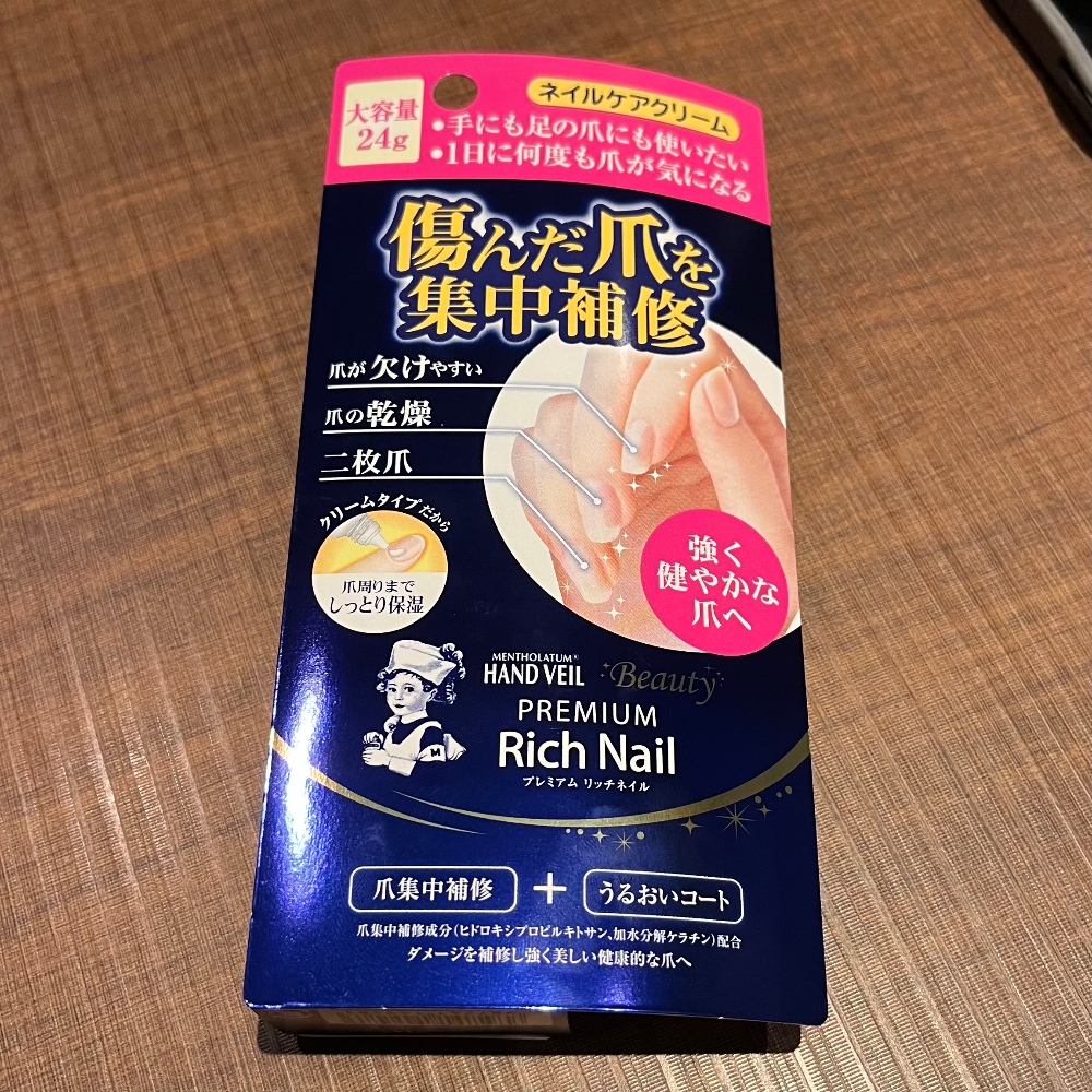 제품 이름은 멘소래담 핸드베일 뷰티 프리미엄 리치네일 (MENTHOLATUM HAND VEIL Beauty PREMIUM Rich Nail)이다. 지나가다 들린 요도바시 카메라 드럭스토어에서 샀는데 손톱 어쩌고 제품이 그럴듯한 게 이거밖에 없어서 선택권이 없었다. 가격은 1320엔.