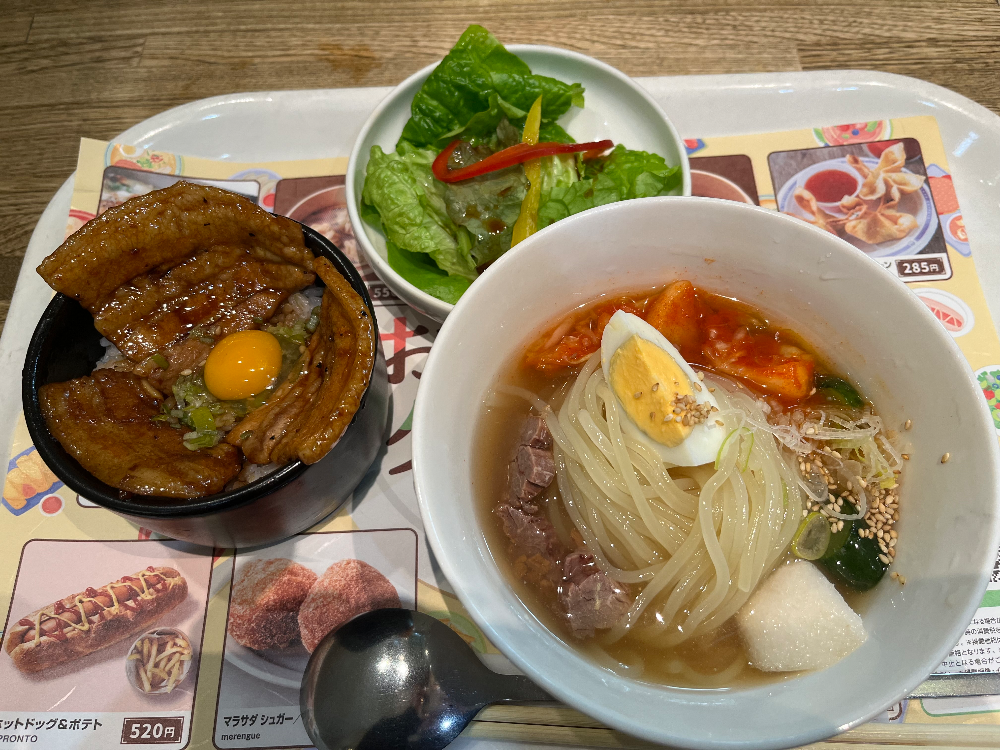 가와사키에서 끼니를 때울 때는 대체로 만만한 푸드코트에서 먹게 되는데, 10번 중에 8번은 내가 좋아하는 판다 익스프레스에서 먹는다. 나머지 2번은 다른 메뉴를 먹는데, 최근에는 한국 음식점인 푠푠샤 엄마 키친(ぴょんぴょん舎オンマーキッチン)에서 모리오카 냉면(盛岡冷麺)과 돼지고기 덮밥(はみだし豚丼) 세트를 먹어보았다.