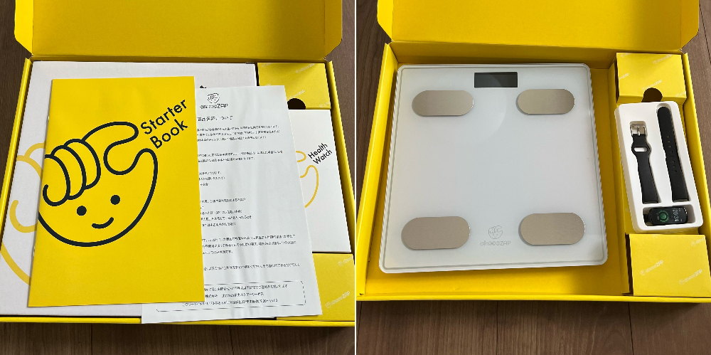 입회를 하면 스타터 키트를 제공하는데, 스타터 키트는 체지방 측정이 가능한 몸무게와 스마트 워치로 구성되어 있다. 이 두 개는 초코잽 애플리케이션과 연동이 되어 운동 기록과 신체 상태 기록에 활용할 수 있다.