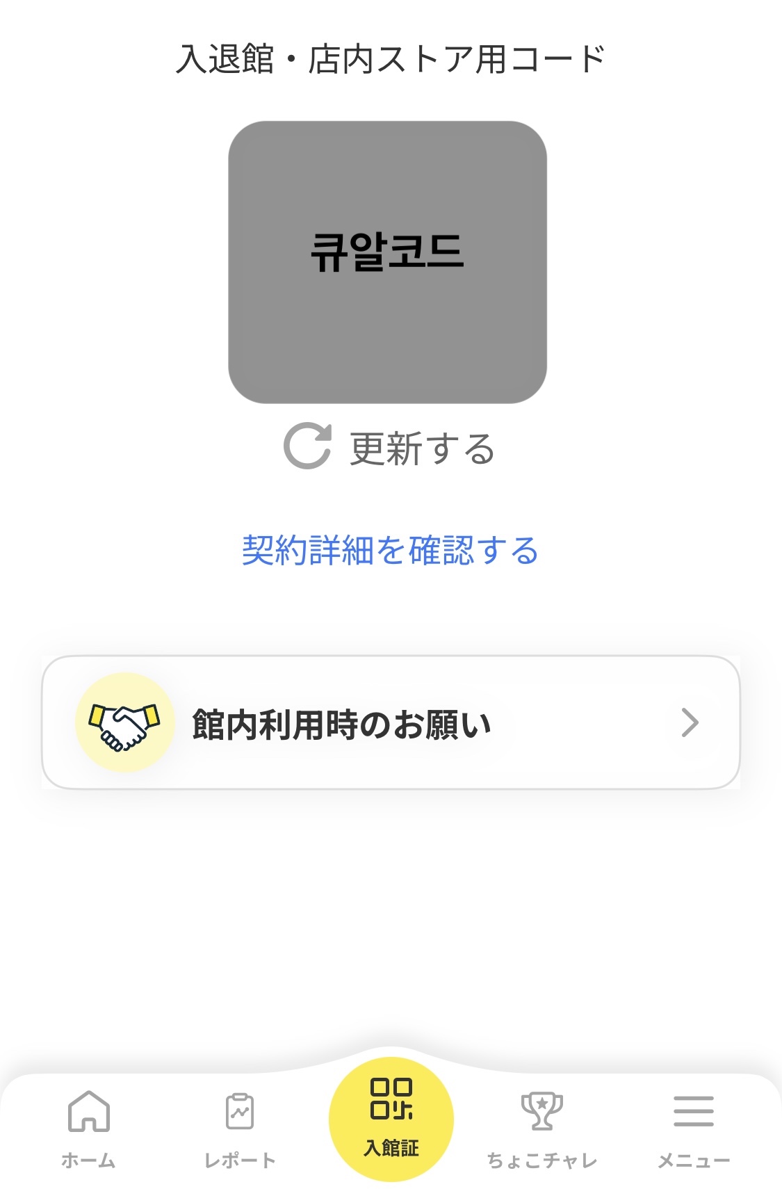 헬스장과 같은 이름의 전용 애플리케이션이 있는데, 이 애플리케이션을 사용하여 점포에 들어갈 수 있다. 입관증 큐알코드를 인식해서 도어의 잠금을 해제하는 방식이다.