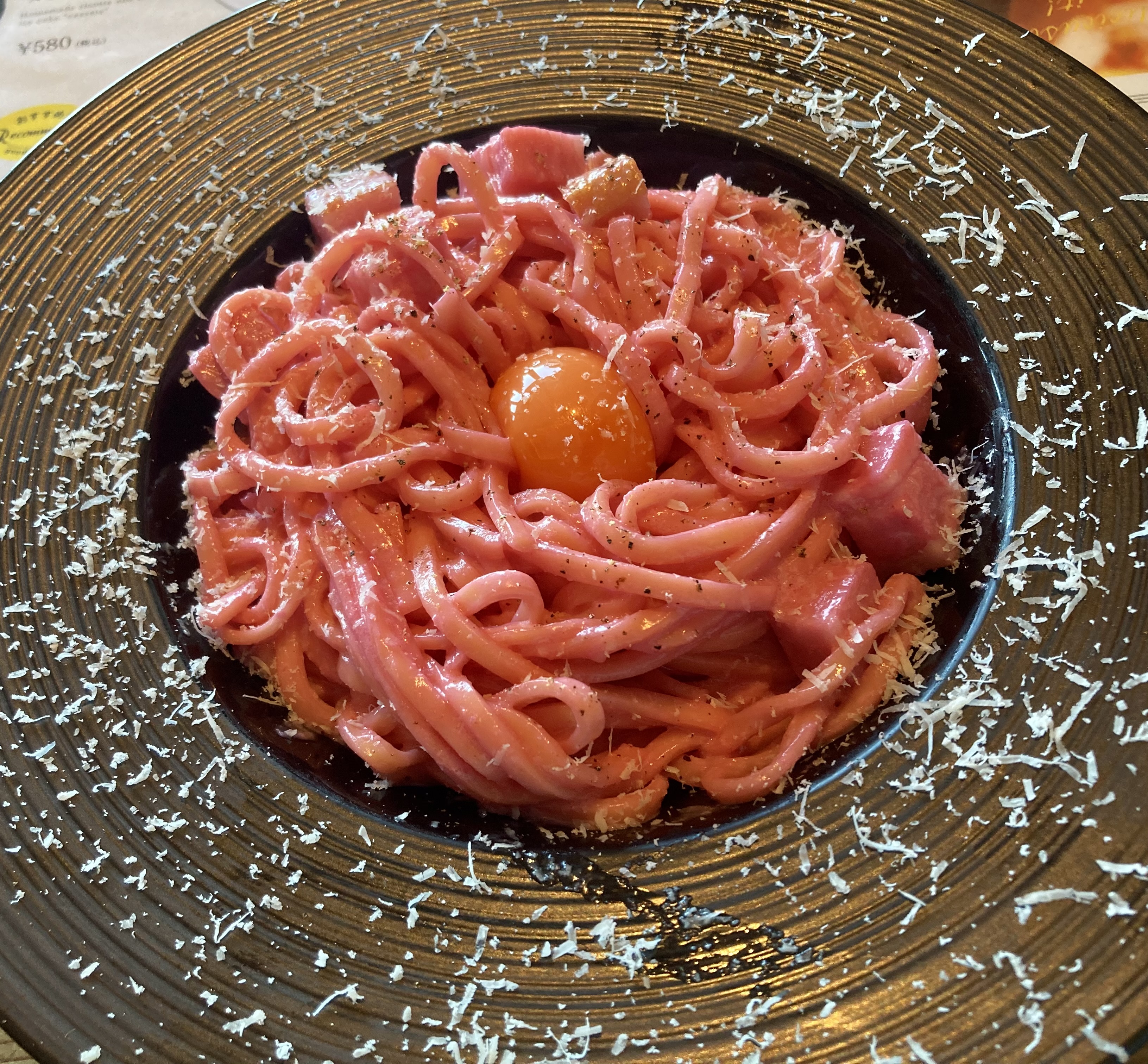 런치 세트의 메인 메뉴는 파스타부터 스테이크, 오므라이스, 샐러드 볼, 갈릭 쉬림프 등 종류가 다양한데, 기본적으로 모든 메인 메뉴에도 치즈가 들어가 있다. 사실 난 치즈 무한리필을 목적으로 간 거라서 메인 메뉴는 그냥 비주얼적으로 특이한 걸 시켜봤다. 핑크색 까르보나라라니... 소스를 비트로 색을 낸 거라고 한다. 사실 메뉴판에 있는 그림에는 계란 노른자가 새빨간색이어서 그것도 은근히 기대했는데 생각보다 빨갛지는 않았고, 일반적인 계란 노른자보다 조금 색이 진할 뿐이었다. 맛은 그냥 평범한 까르보나라였는데, 면이 꽤 두껍고 탱탱한 라멘의 후토멘st 면발이어서 개인적으로 좋았다.