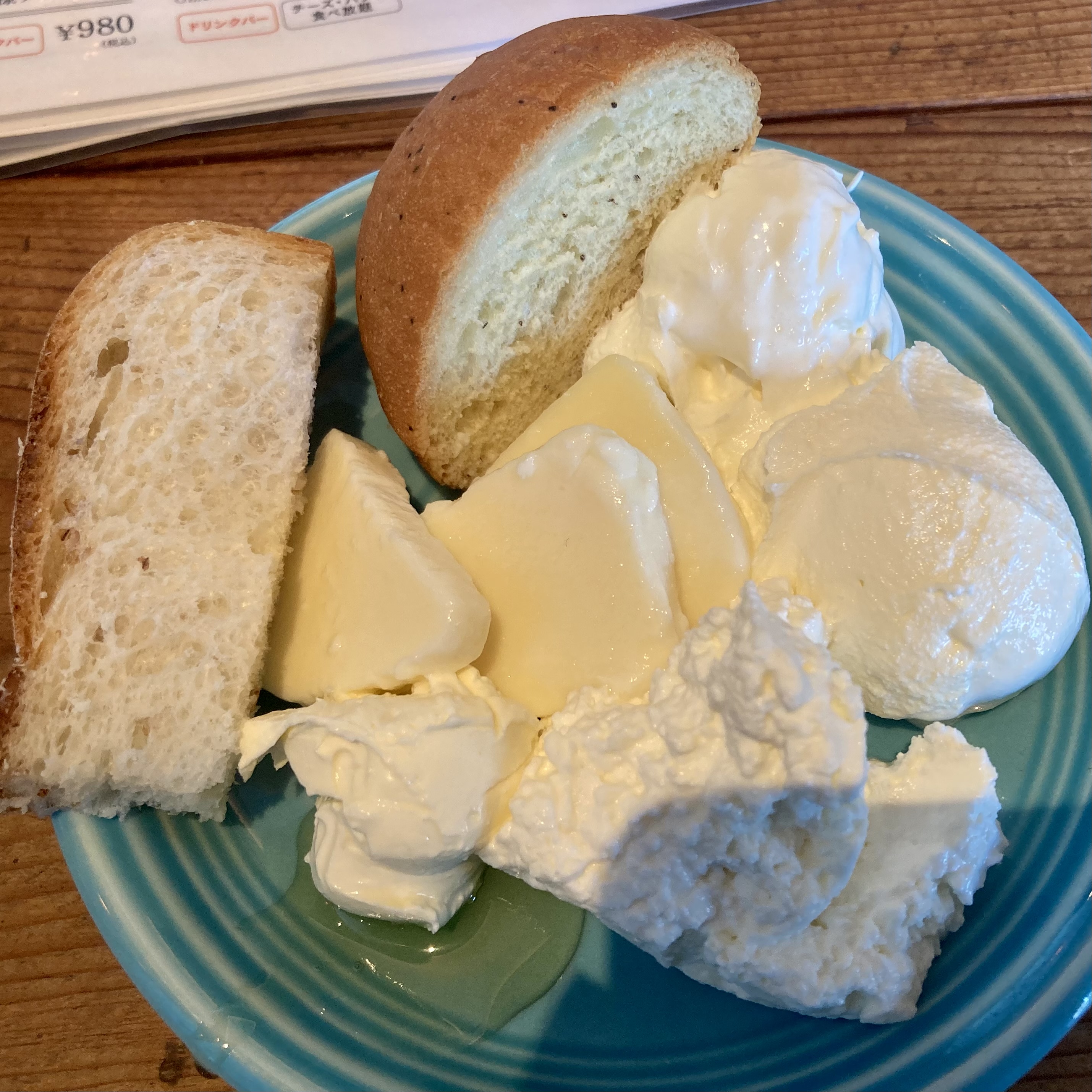 평일 점심 기준 런치세트는 1980엔부터 메인 메뉴에 따라서 추가금이 붙을 수 있다. 메인 하나에 치즈랑 빵 무한리필인데 이 정도 가격이면 꽤 합리적이라고 생각한다. 디너에 가도 치즈/빵 무한리필(600엔)이 있긴 한데 메인 메뉴를 따로 주문해야 해서 메인 메뉴를 추가할 경우 아무래도 가격이 조금 올라간다. 근데 술안주 한 두 개 정도만 시키면 오히려 더 싸진다.(메인 메뉴 주문이 필수인지는 잘 모르겠다.)