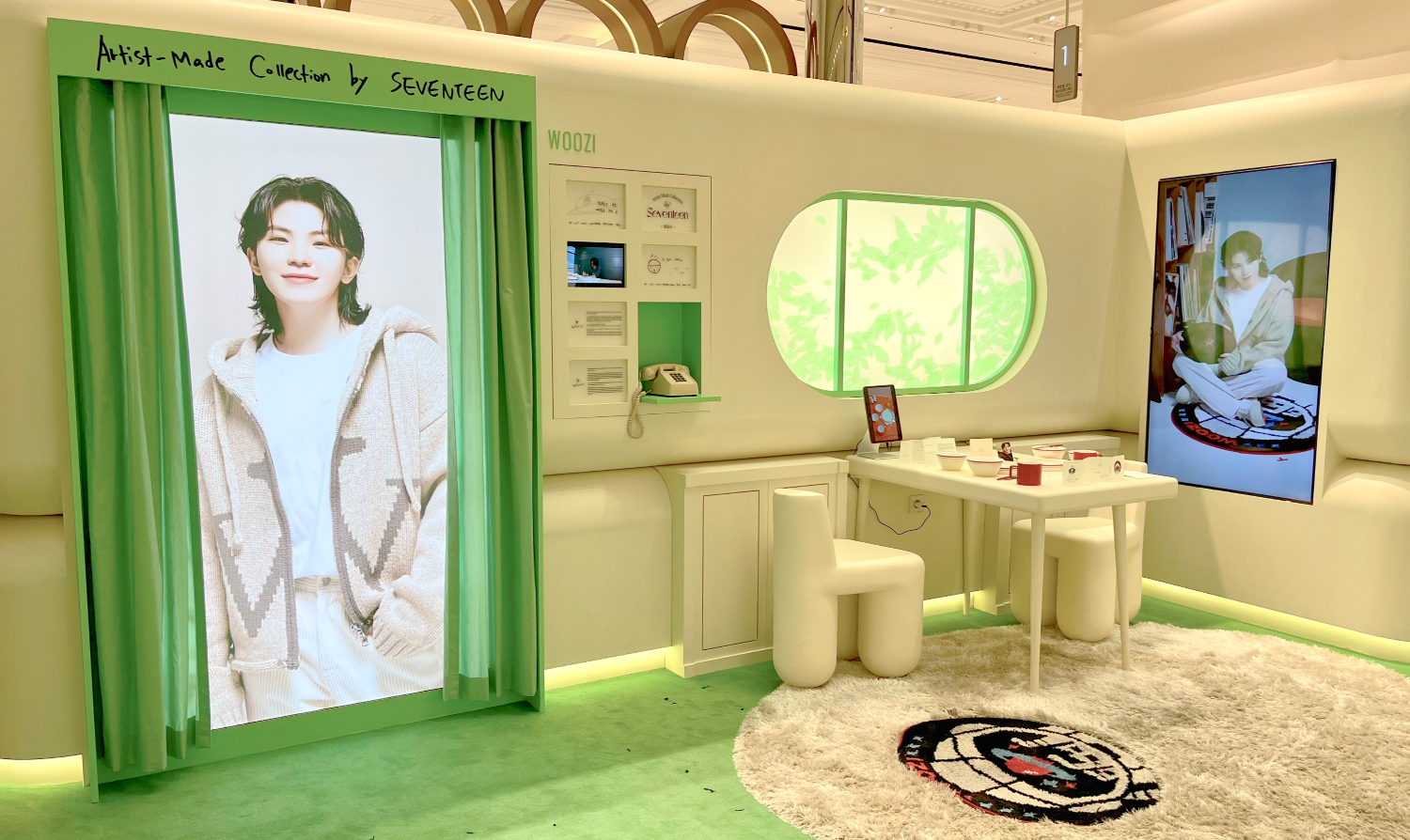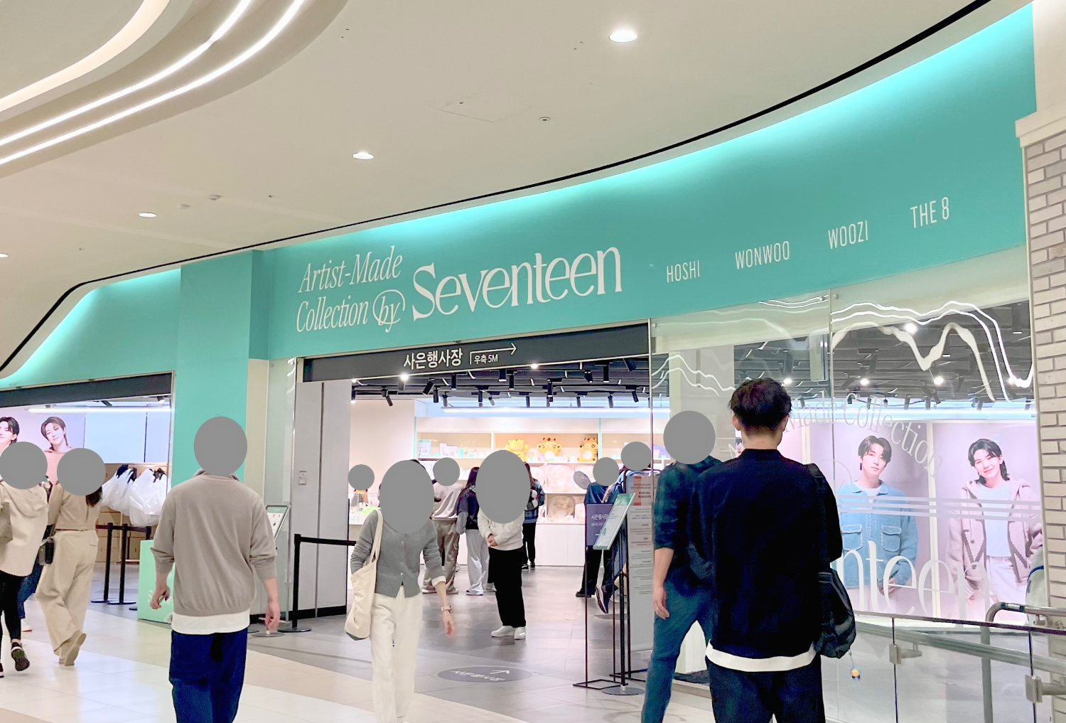 백화점 1층 중간에 아티스트 메이드 컬렉션 by 세븐틴의 전시장(?)이 떡하니 있었는데, 바로는 못 들어가고 대기 예약을 한 후에 입장을 할 수 있었다. 핸드폰 번호 1개당 1명 입장 예약을 할 수 있었고, 앞에 대기 팀이 꽤 있길래 한두 시간은 기다릴 줄 알았는데 30분도 안 돼서 지금 입장하라고 연락이 와서 또 다른 목적지였던 삼성 매장 찾다가 후다닥 내려갔다. 그나저나 전시장 테마색이 샤월이었던 나에게 너무 익숙한 색이었는데 관련은 없는 거겠지?