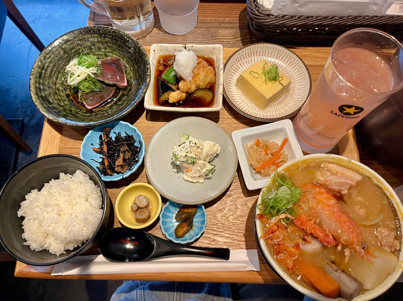 주문한 돈지루고젠(とん汁御膳:季節のとん汁変更). 고젠은 밥+돈지루+절임/무침 반찬 4종+샐러드+치킨남바+가쓰오 다다키+계란말이로 구성되어 있다. 돈지루는 계절 돈지루로 변경을 할 수가 있어서 변경을 했다. 계절 돈지루는 새우가 들어간 새우 돈지루였다. 일본음식답게 전체적으로 짰지만 그건 일본음식 특이라 적응한 부분인걸 감안하면 모든 반찬이 다 맛있다고 느꼈다. 역시 돈지루 맛집답게 돈지루가 지금까지 먹어본 돈지루 중에서 가장 진하고 건더기가 돈지루 그릇 빽빽하게 들어차 있는 게 아주 감동적이었다.