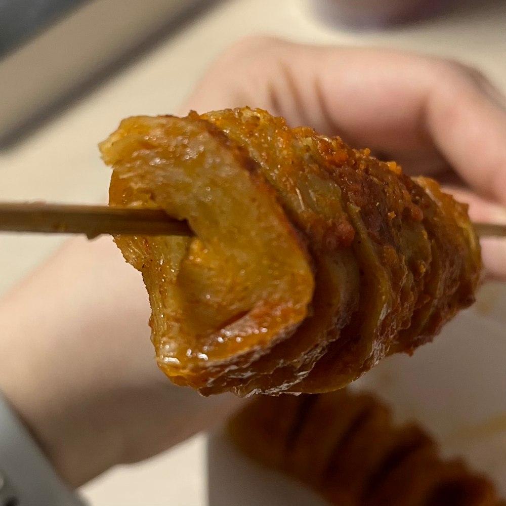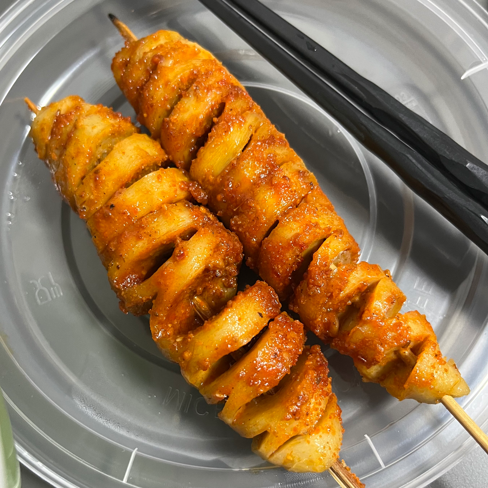 인터넷에 찾아보면 두부를 회오리 모양으로 꼬치에 꽂아 매콤한 소스를 발라 구운 중국 전통 음식이라는 설명이 있다. 그런데 또 다른 글에는 밀가루로 만들어서 글루텐꼬치라고도 한다. 도대체 뭐가 진짜 재료인지 아직도 미스터리인데 어딜 봐도 고기라는 설명은 없었다.