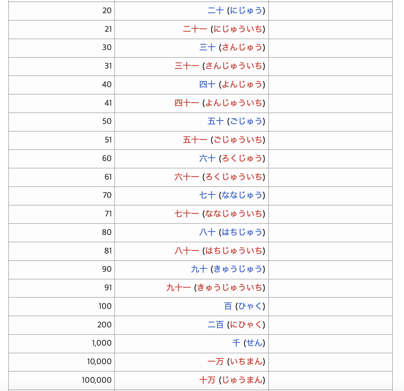 아마 10까지는 일본어를 배울 때 날짜나 사람, 물건을 세면서 훈독도 배우기 때문에 일본어를 접했다면 어느 정도 친숙할 것이다. 그리고 20도 나이를 말하면서 많이 접하기 때문에 나름 익숙한 훈독이다. 개인적인 경험이긴 하지만 나 같은 경우에 30 정도부터는 훈독을 듣는 일이 그렇게 많지 않아서 모르고 있다가 일본에 와서야 종종 듣고 겨우 익숙해졌다.