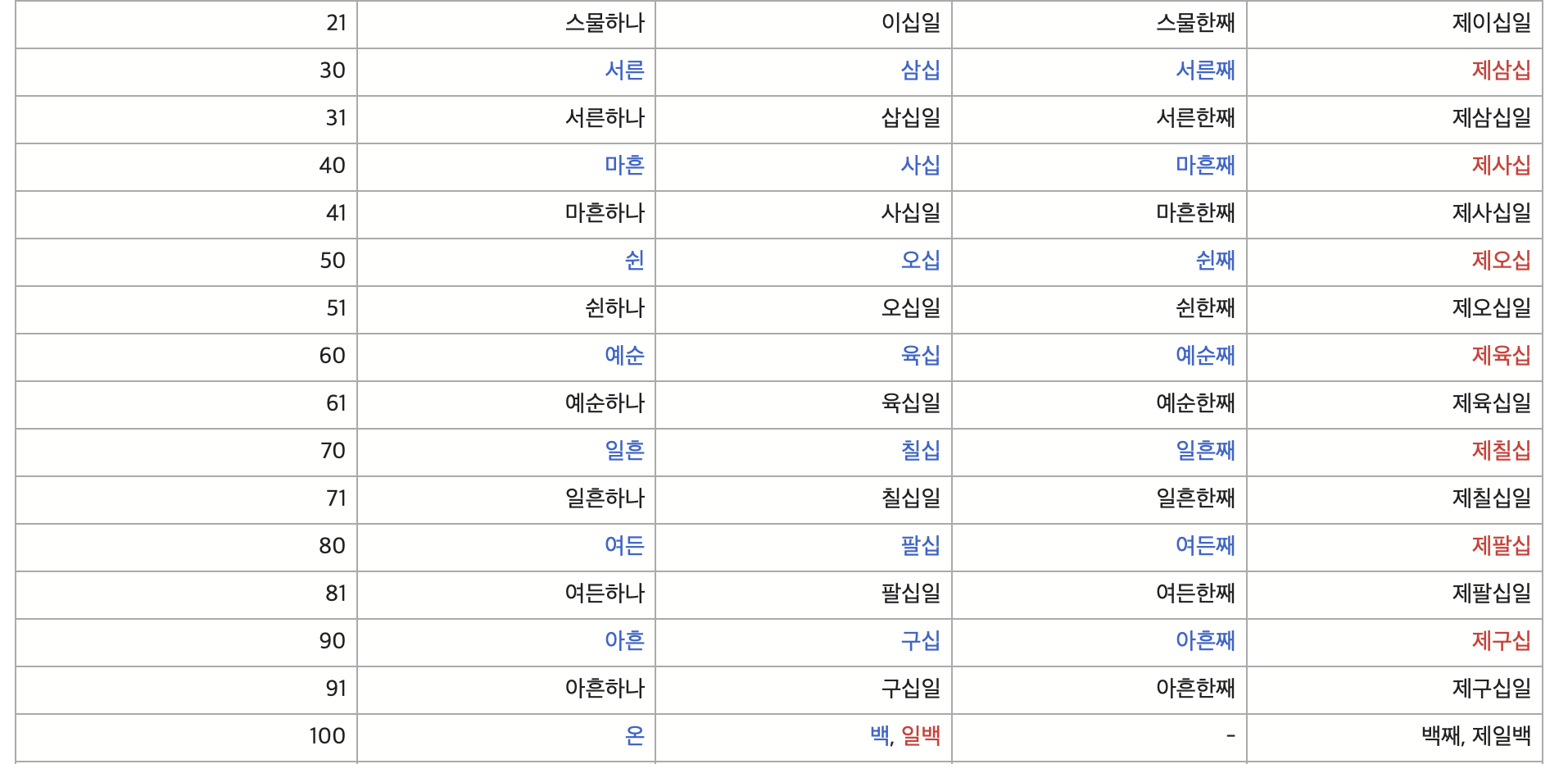 특히 50을 넘어가면 그 난이도가 극악무도 해진다. 50을 쉰과 오십, 60을 예순과 육십, 70을 일흔과 칠십, 80을 여든과 팔십, 90을 아흔과 구십, 100을 온과 백이라고 읽을 수 있는데, 외국인 입장에서 생각해 보면 이게 무슨 소리인가 싶을 거다.
