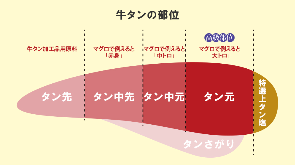 소고기 혀는 일반적으로 끝(先), 중간(中), 뿌리(根元) 세 부분으로 나뉘는데, 각각의 부분은 이하와 같이 다른 특징과 식감을 가지고 있다.