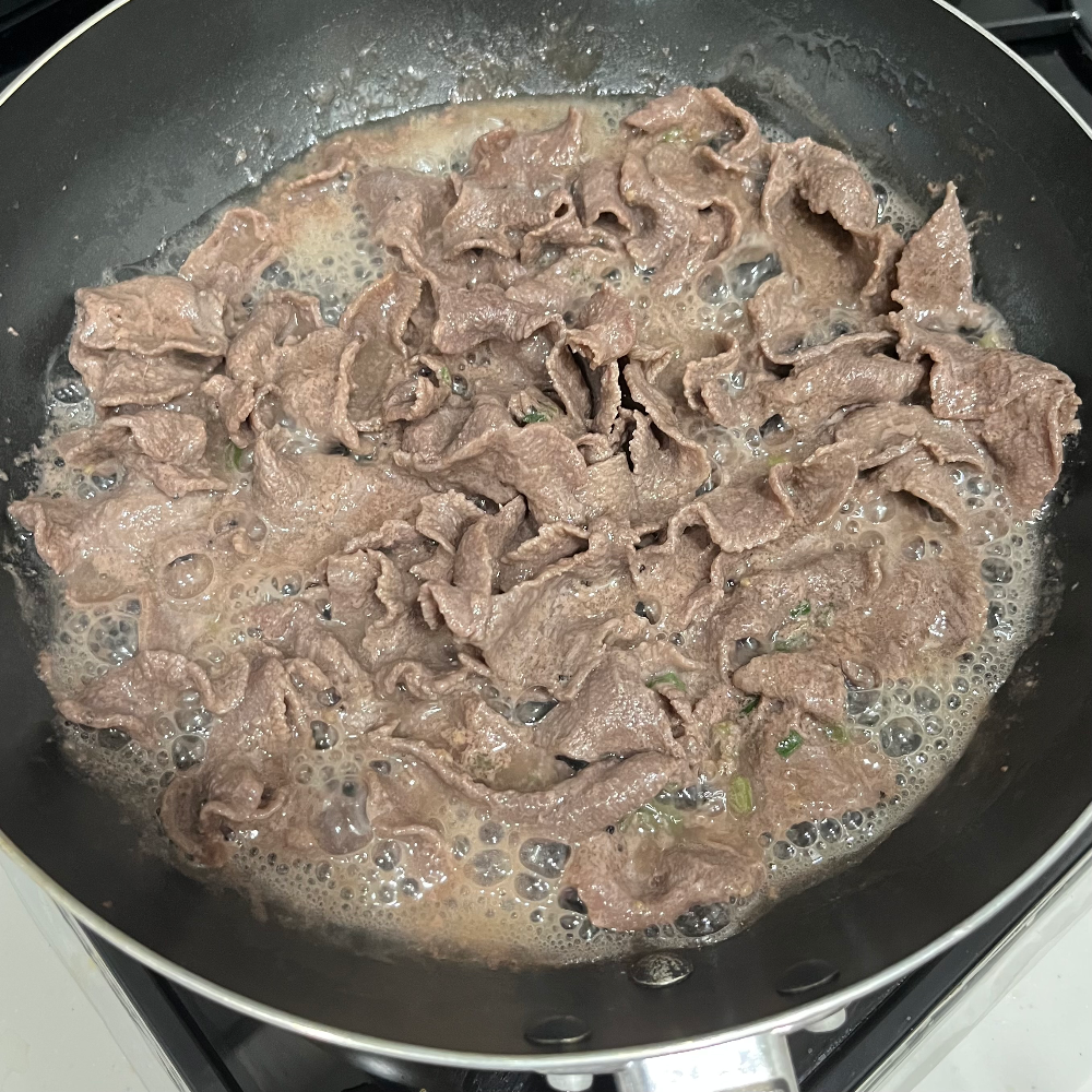 딱히 조리 방법이 적혀있는 건 아니고 잘 익혀서 먹으라고만 적혀있길래 냅다 프라이팬에 떼려 넣고 구웠다. 하나하나가 얇아서 5분도 안 돼서 금방 익었고 뚜껑을 열어보니 단백질이 많은 부위답게 거품이 꽤 올라온 게 보였다.