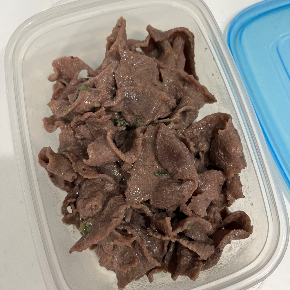 반찬으로 먹을 생각으로 반찬통에 담아 주었다. 지방이라고는 1도 안 보이는 이 갈색의 고기를 봐. 먹어본 후기는 레몬소스맛이 강해서 그런지 맛의 특징은 잘 모르겠더라. 엄청 맛있지는 않았다. 딱딱한 부위라길래 각오를 하고 먹었는데, 한 개씩 먹을 때는 엄청 딱딱하지도 않고 먹을만하다 싶어서 세네 개씩 한꺼번에 입에 넣고 씹었더니 턱이 빠지는 줄 알았다. 고기 몇 점 먹다가 힘들어서 입 스트레칭 해본 건 처음이었다. 얇게 슬라이스 해서 파는 데에는 다 이유가 있는 거다.