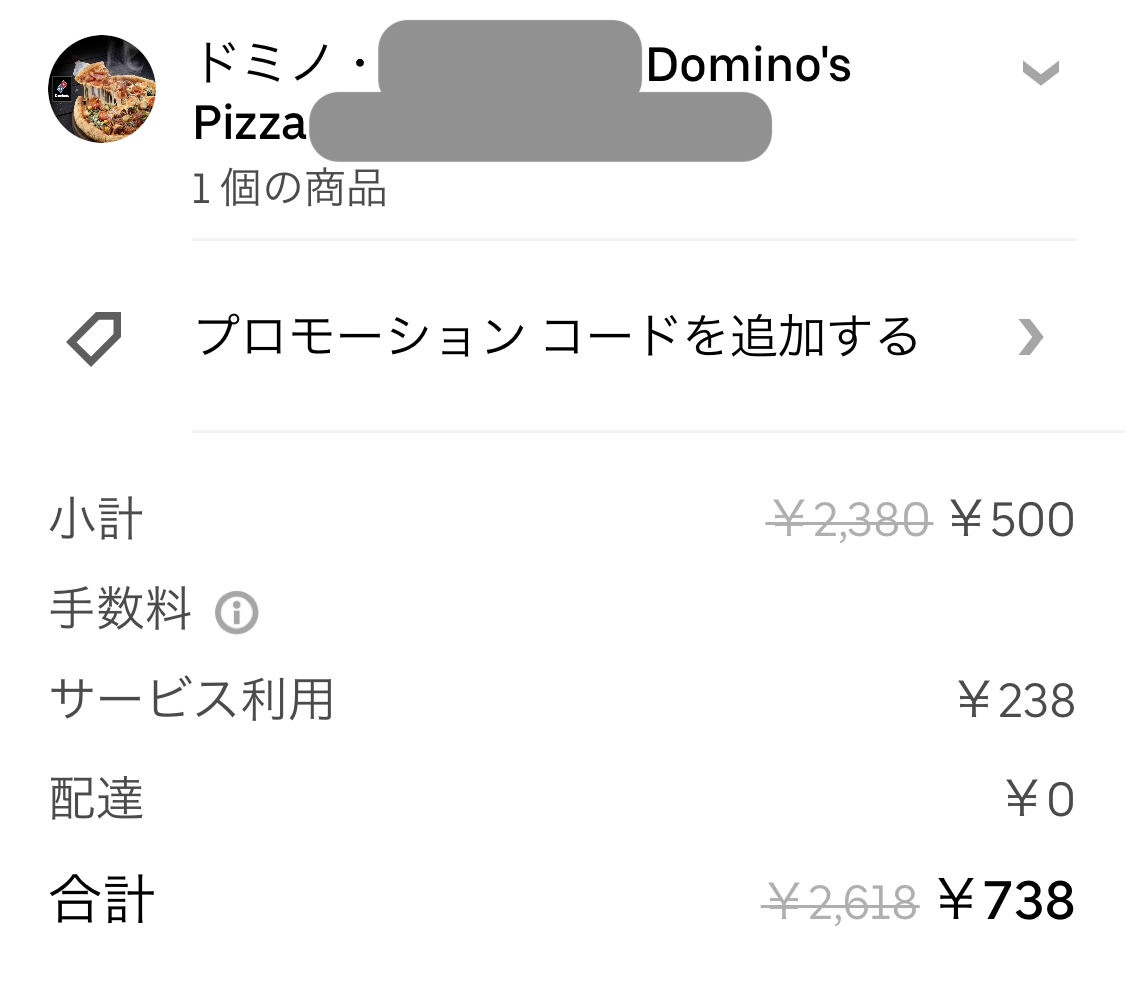 그런데 우버 이츠에서 도미노 피자 메뉴를 보니, 우버 이츠 원(월정액 멤버십) 가입 후 처음 주문 시, S사이즈 피자를 500엔으로 주문할 수 있었다. 와우. 일본 피자집은 원래도 저렴하지만(정가는 비싼데 반값할인을 안 하는 날이 없음) 500엔, 서비스료 포함이어도 738엔이라니... 바로 사 먹어보았다.