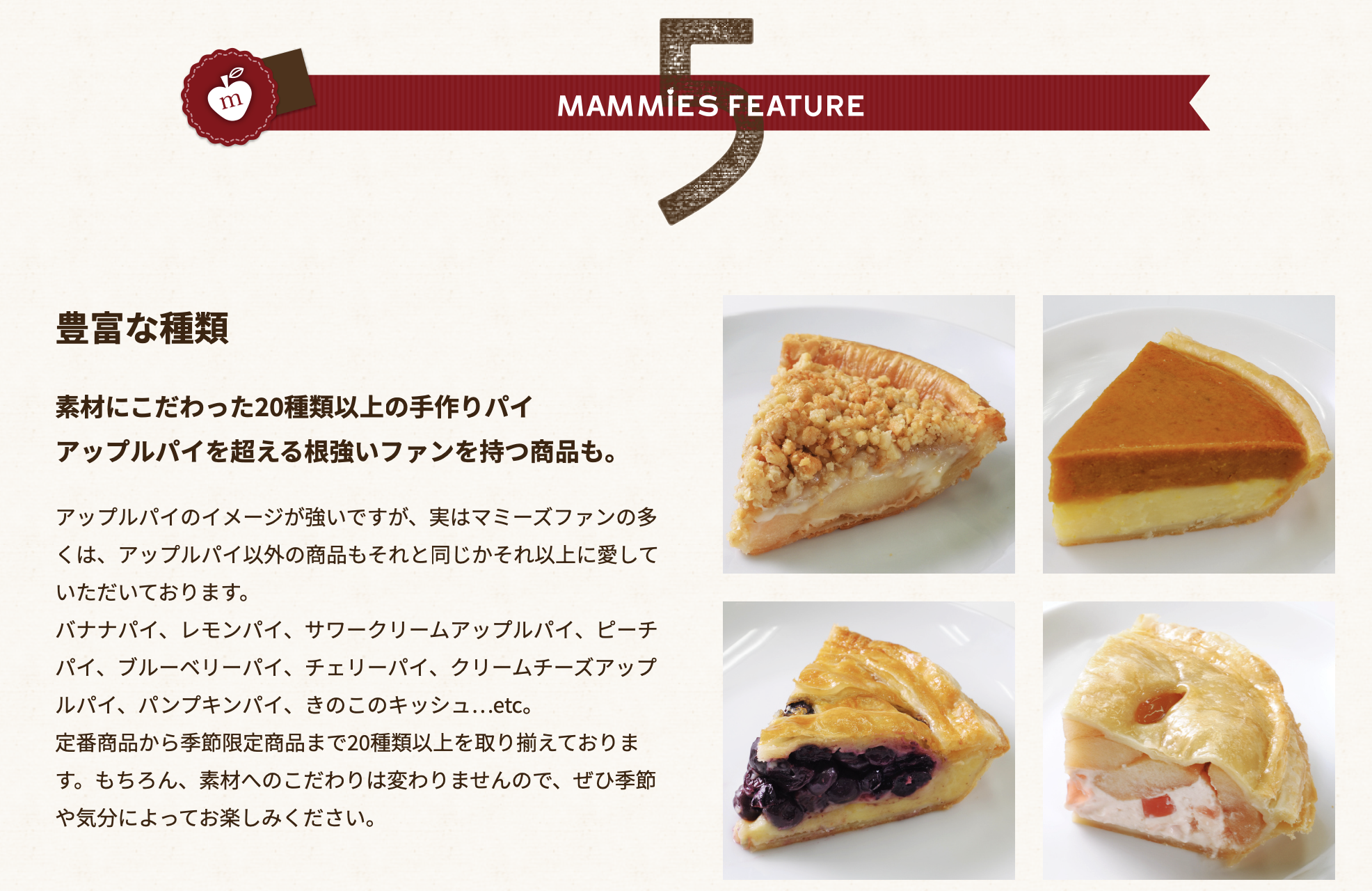 애플파이는 일반 애플파이(725엔†), 어른의 애플파이(750엔†), 홍옥 애플파이(775엔†), 바삭 크림 애플파이(675엔†), 크림치즈 애플파이(775엔†) 5종류가 있다. 바삭 크림 애플파이를 제외하면, 파이 반죽 안쪽을 두툼하게 채운 사과 조각이 한가득 보이는 것, 파이 반죽이 사과들을 겨우 견딜 정도의 얇은 두께를 가지고 있는 것이 이곳 파이의 특징이다.