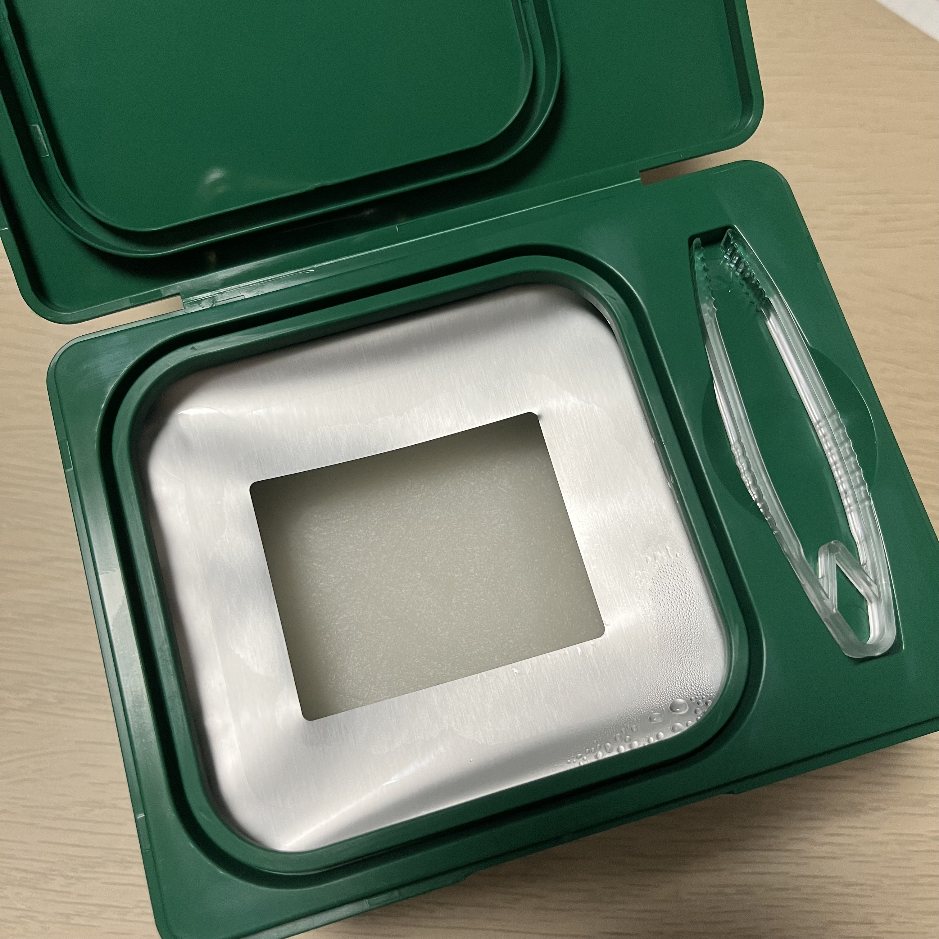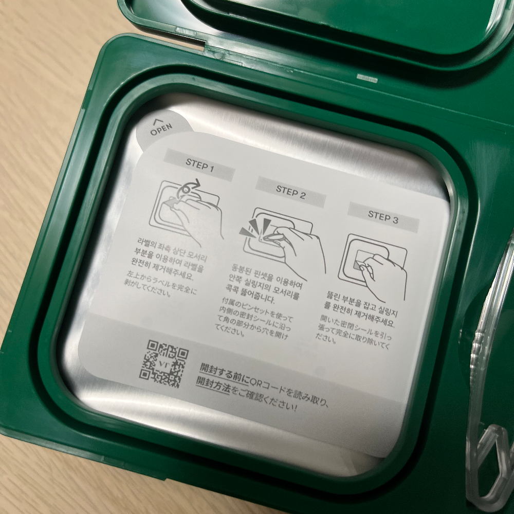 암튼 이렇게 뚜껑을 열면 밀봉된 비닐과 집게가 있는데, 비닐 중앙을 잘 방법대로 뜯어내면 사각형모양으로 예쁘게 잘 뜯어진다. 안에 들어있는 팩을 집게로 잘 잡아 1개씩 사용하면 된다. 보관은 뚜껑을 잘 닫아서 냉장고에 보관을 하고 있다.