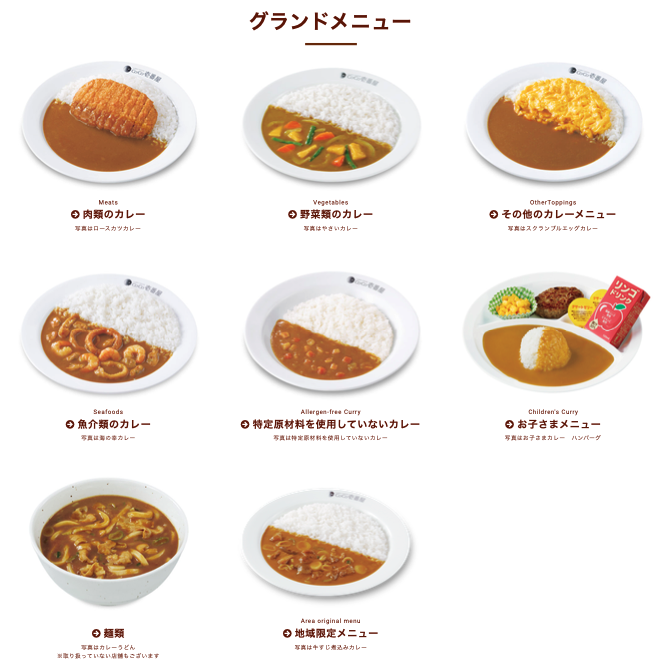 기본은 포크 카레. 그 외에 포크 카레(달달한 맛), 비프 카레, 코코이치베지카레, 하야시라이스로 총 5가지 종류가 있다. 하야시라이스는 점포에 따라 제공하지 않는 곳도 있다.