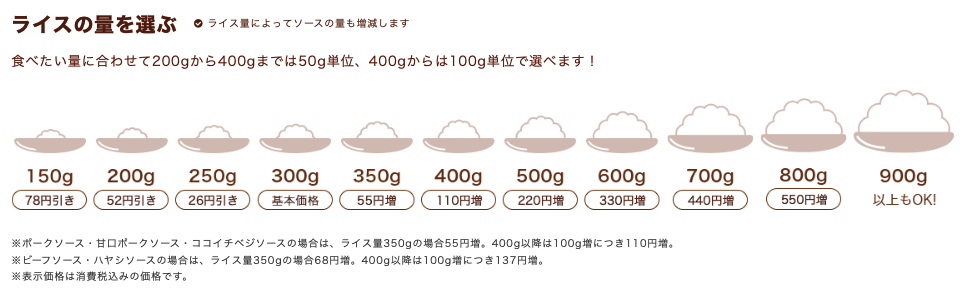 기본은 300g이고, 최저는 150g까지 최대는 무한대(?)까지 선택이 가능하다. 기본 양보다 적으면 금액이 마이너스, 많으면 플러스가 된다. 코코이치를 좋아하는 이유 중 하나.