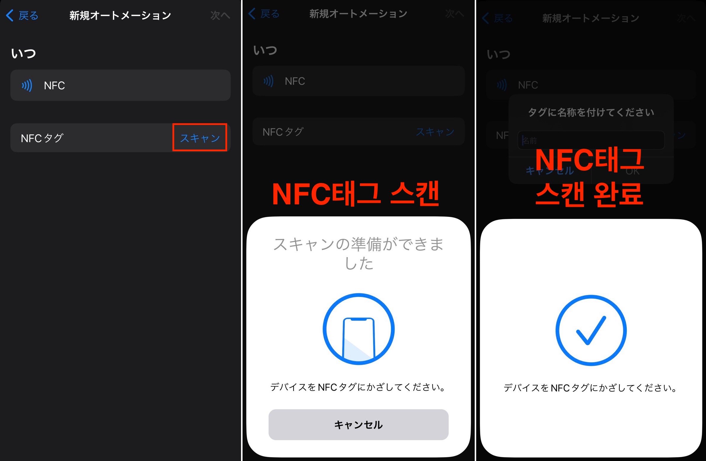 스캔 버튼을 누르면 스캔 준비가 되었다는 안내 화면이 뜨는데, 이때 준비한 NFC태그나 NFC스티커를 아이폰 뒷면에 대준다. 정상적으로 스캔이 되면 이미지의 맨 오른쪽 화면처럼 체크표시로 바뀐다.