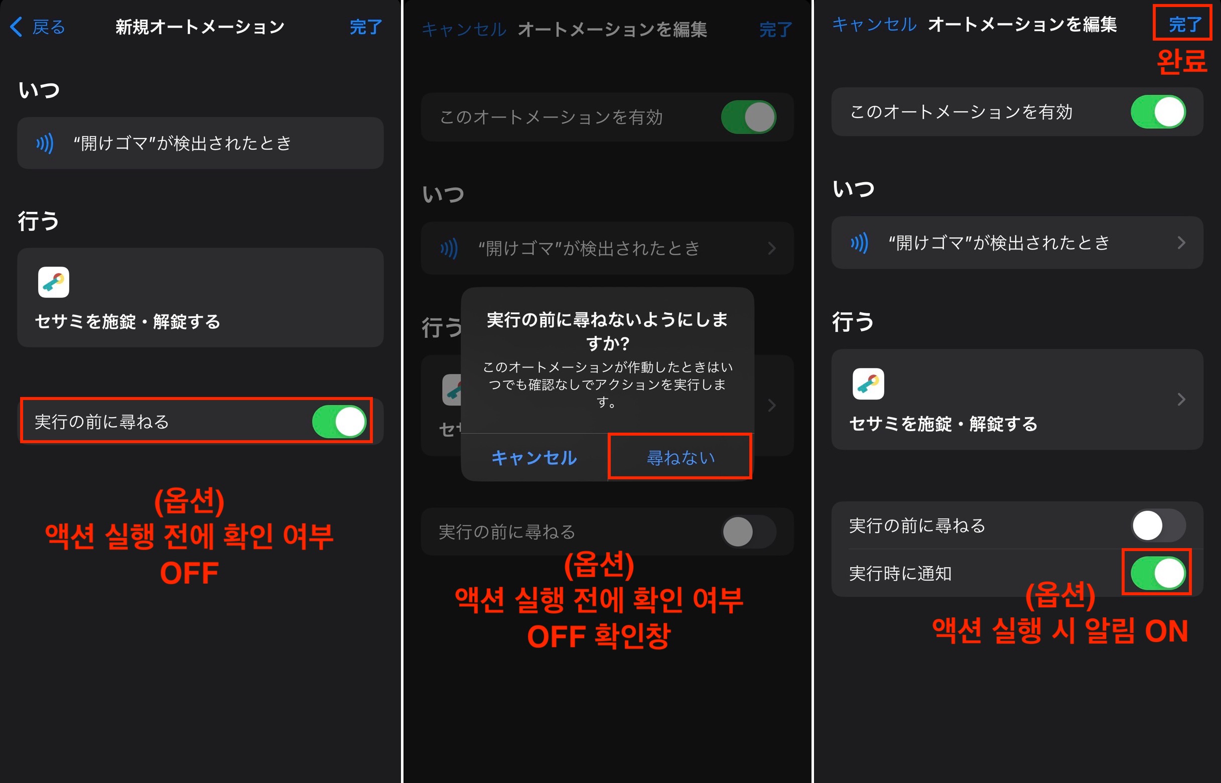 액션 등록 후 다음을 누르면 액션 실행 시 아이폰에서 수행할 동작을 설정하는 화면이 나온다. 디폴트로는 액션 실행 시 확인을 하도록 하는 토글이 ON으로 되어있다. 이게 ON이면 태그를 인식 후 지정한 동작을 실행해도 되는지 핸드폰에서 확인을 요구한다. 폰 화면 조작하기 싫어서 자동화하는 건데 나한테 또 확인을 하고 실행을 하도록 하면 의미가 없기 때문에 이 토글을 OFF로 해줬다. 실행은 태그 인식 후 확인 없이 진행하지만 액션이 실행된다는 통지는 폰으로 받을 수 있도록 설정해 줬다.