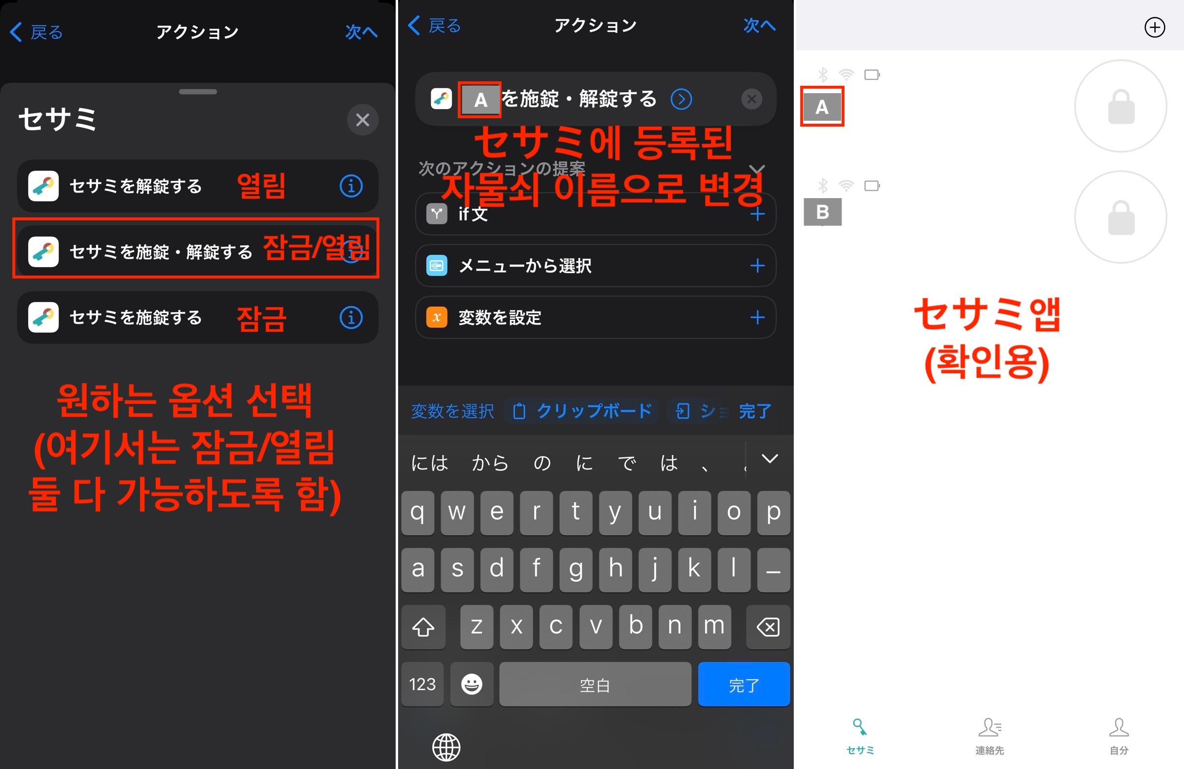 세사미 앱은 잠금 / 잠금 및 열림 / 열림 이 3가지 동작의 실행을 지원한다. 원하는 실행 옵션을 선택하면 해당 액션이 추가되는데, 이때 추가된 액션에서 잠금장치의 이름을 편집해 줘야 한다. 이 이름은 세사미에 등록된 자물쇠 이름과 반드시 같아야 한다. 나는 일단 여기서 A자물쇠의 조작을 등록해 줬다.