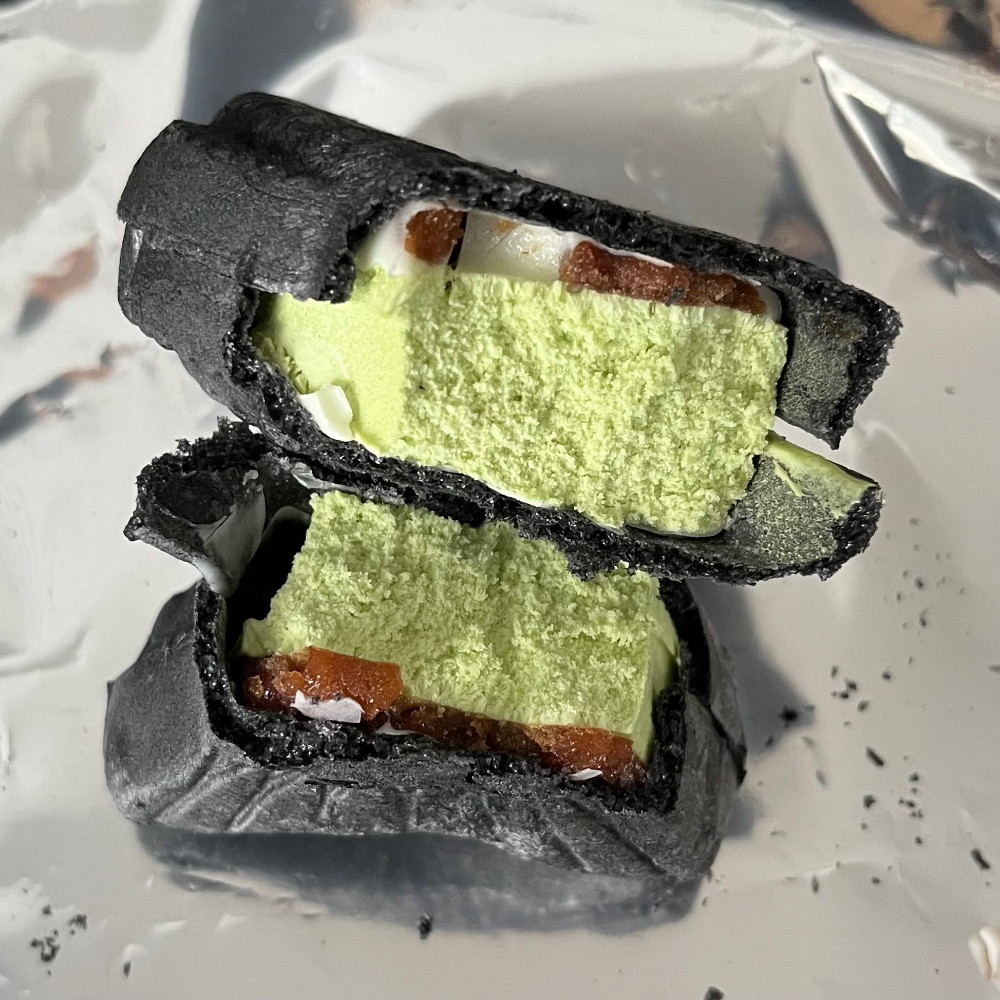 두 동강을 내보니 모나카 안쪽은 화이트 초코 코팅이 얇게 발려 있었고, 안에는 팥앙금과 말차맛 아이스크림 층으로 구성되어 있었다. 팥앙금은 검은 꿀 풍미의 쯔부앙이라고 한다. 모나카가 검은색이긴 한데 여기에 딱히 맛이 있는 건 아니었다.