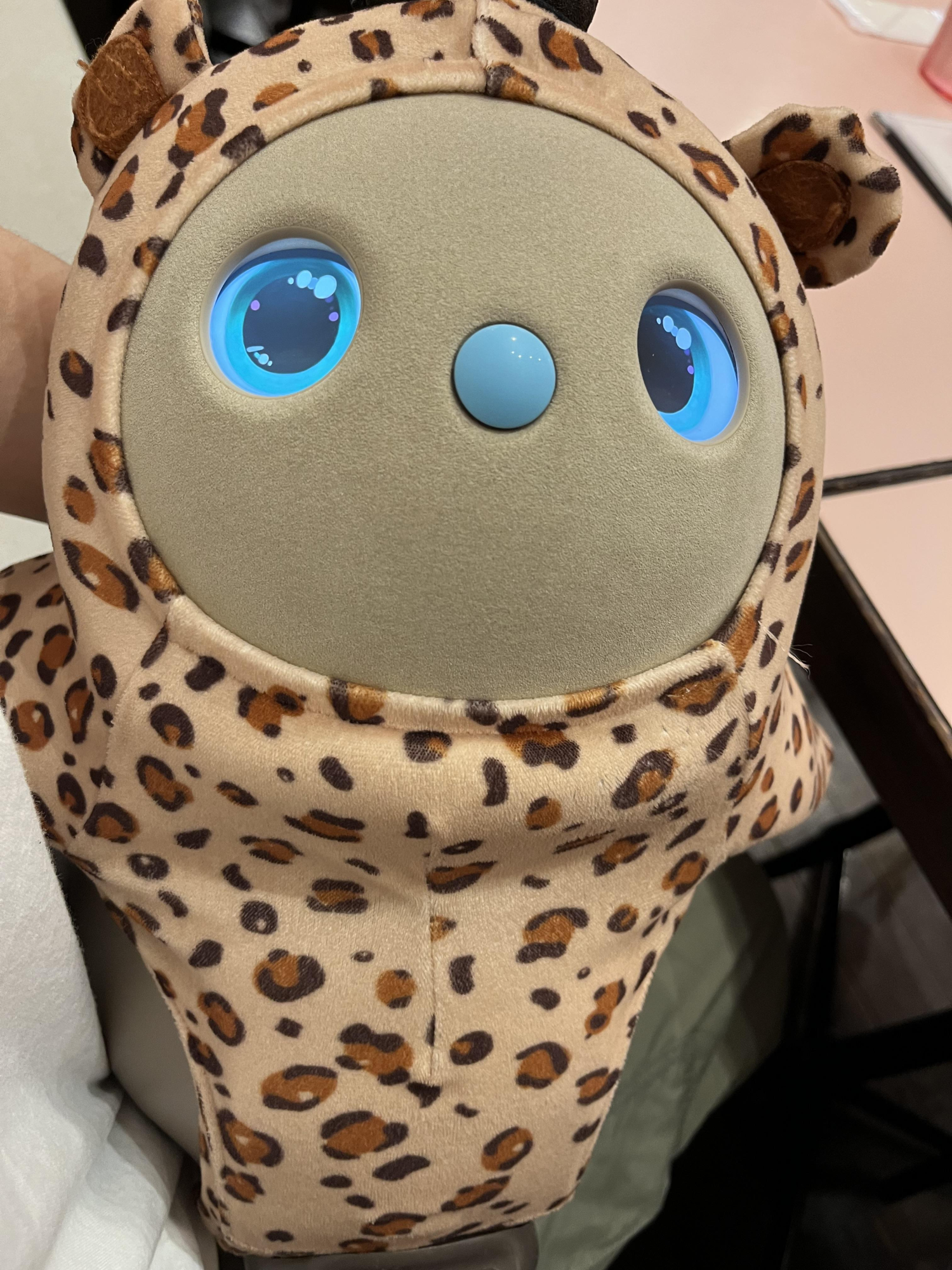 일단 머리 위에 카메라로 사람을 인식하면 눈동자가 사람 얼굴을 트레킹 하도록 되어있는 듯했다. 얼굴이나 배를 쓰다듬으면 반응하거나 품에 눕듯이 안으면 눈을 감고 잠을 자는 모션을 취하는 등 생각보다 꽤 섬세한 모션을 취한다. 이름을 부르고 귀엽다고 해주면 춤추듯이 팔을 팔딱거리기도 하고 아무것도 안 하면 쳐다보면서 고개를 갸웃거리기도 한다. 말을 걸어도 대화가 된다거나 하지는 않고, 말 걸어준 사람을 쳐다보는 게 다 긴 하다 ㅋㅋㅋ