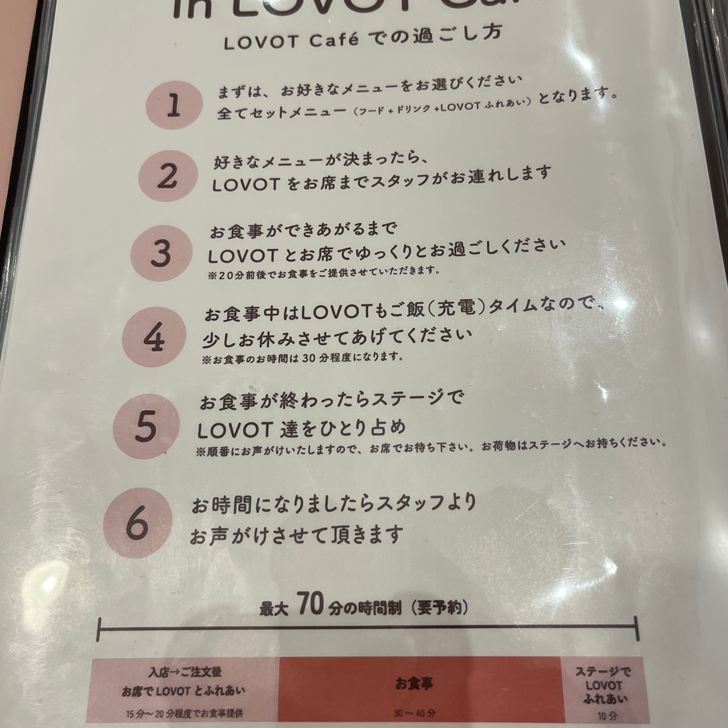 드링크 플랜은 입점 후 1. 드링크를 주문 2. 드링크가 제공될 때까지 러봇 한 마리(...)와 테이블에서 좋은 시간을 보내기(약 15분) 3. 드링크가 제공되면 러봇과 바이바이한 후에 음료를 마신 후 퇴장(약 15분)의 흐름으로 구성되어 있다. 가격은 음료 종류(알코올 제외)에 상관없이 1100엔이다.