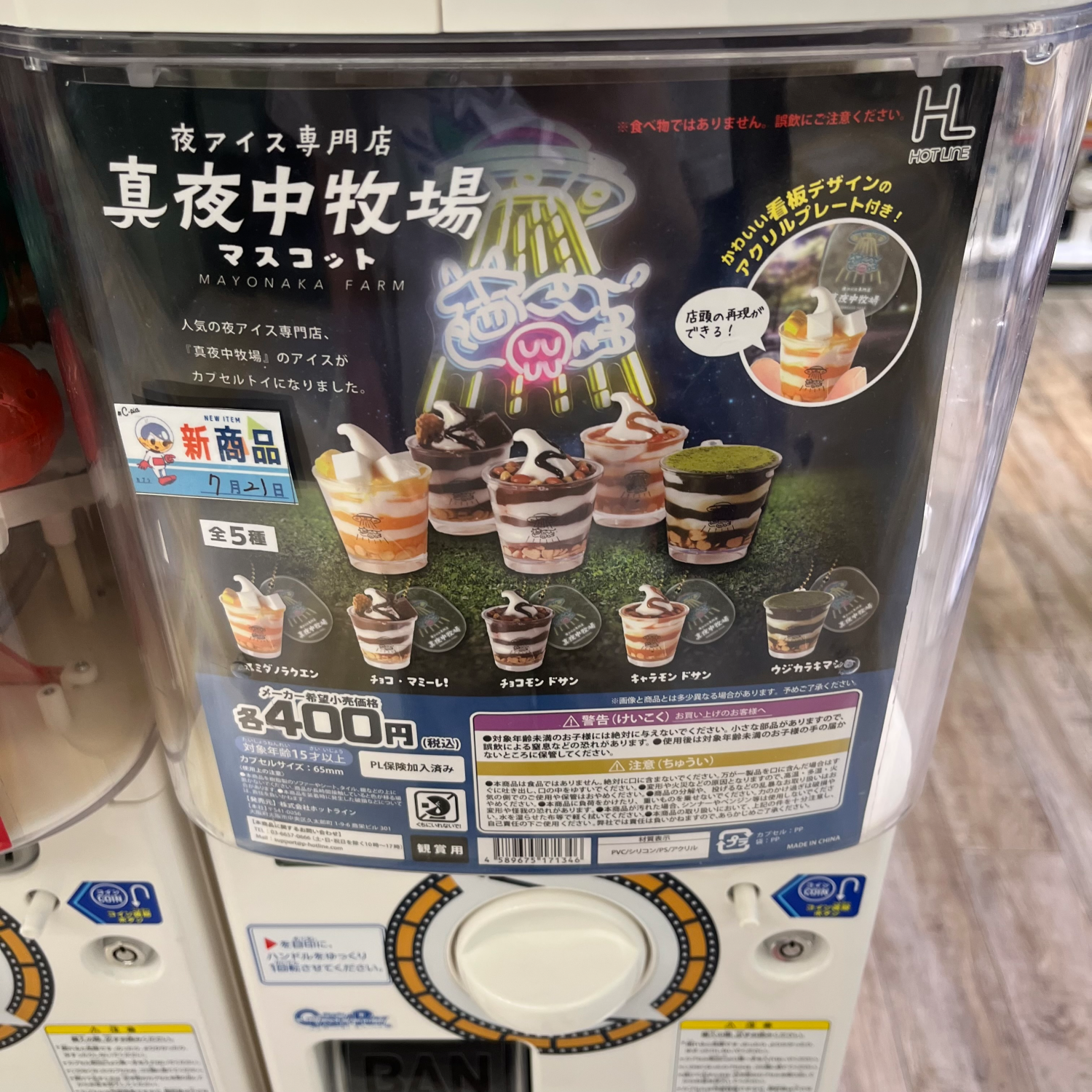 한국에 요아정이 있다면 일본에는 요루아이스가 있다(?) 2022년도인가 2023년도쯤부터 슬금슬금 밤 아이스크림(夜アイス, 요루아이스)이라는 키워드가 유명해졌다. 요루아이스는 말 그대로 밤에 먹는 아이스크림이라는 뜻으로 늦은 오후에 오픈해서 심야까지 장사를 하는 아이스크림 전문점이 SNS를 통해 유명해지면서 생겨난 용어라고 알고 있다. 이 가챠는 그중에서도 '한 밤중 목장(真夜中牧場)'이라는 아이스크림 가게를 모티브로 해서 나온 가챠이다.