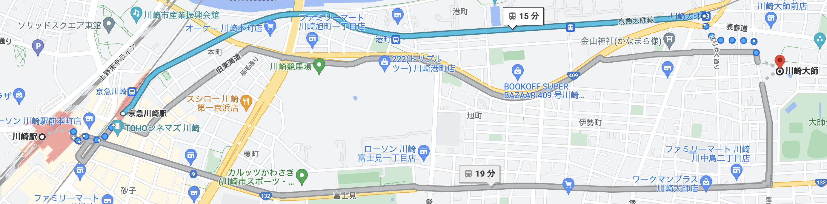 아무튼 가와사키 대사는 가와사키 역에서 매우 멀기 때문에 걸어서 가는 것보다는 전철을 타는 게 낫다. 여름에 걸어서 가봤는데 괴로웠고... 중간에 볼 것도 없어서 노잼이다. 케이큐 가와사키역(京急川崎駅)에서 다이시센(大師線)을 타고 가와사키 다이시마에(川崎大師前)에 내리는 게 베스트.