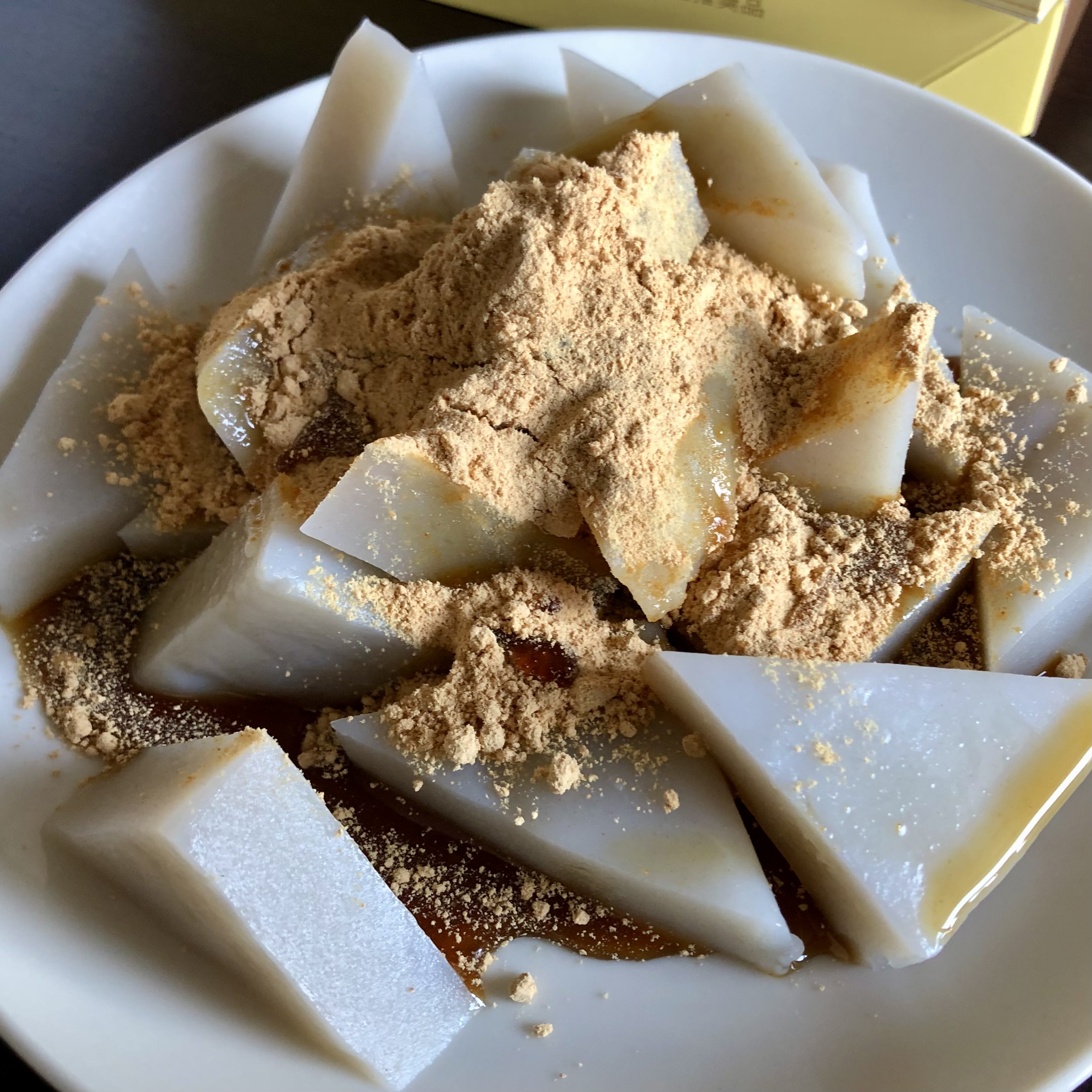 그리고 이게 쿠즈모찌(久寿餅)인데, 발효 떡이다. 떡...이라고 해야 하나 묵...이라고 해야 하나 그 사이의 무언가 이고 떡 자체로는 별 맛이 안 난다. 콩카루(きなこ)와 쿠로미쯔(黒みつ)를 뿌려서 먹는 음식이다. 딱히 맛 자체로 호불호가 있을 것 같지는 않은데, 굳이 이걸 먹어? 싶은 맛일 수는 있다고는 생각한다. (진짜 별맛 안 나서...)