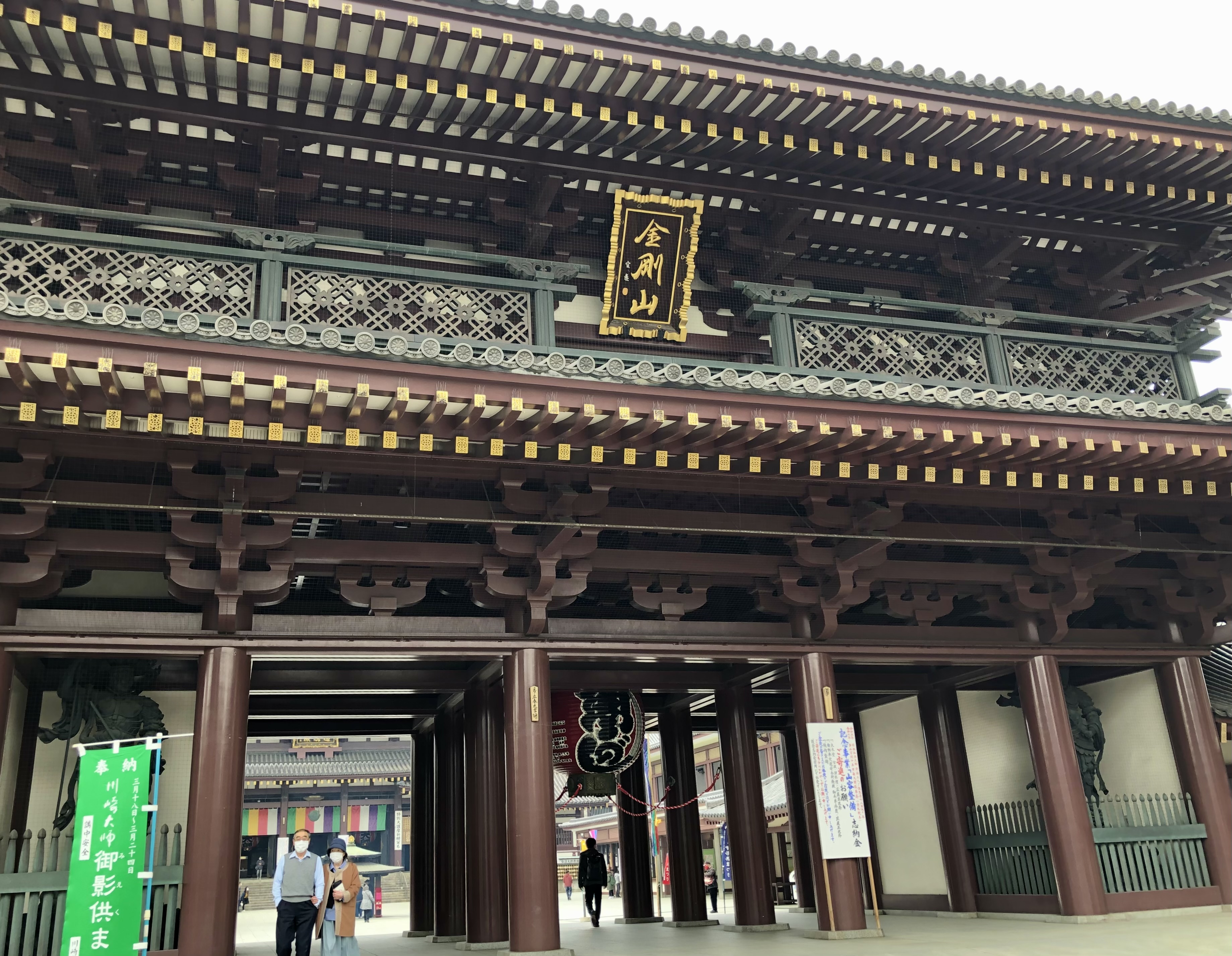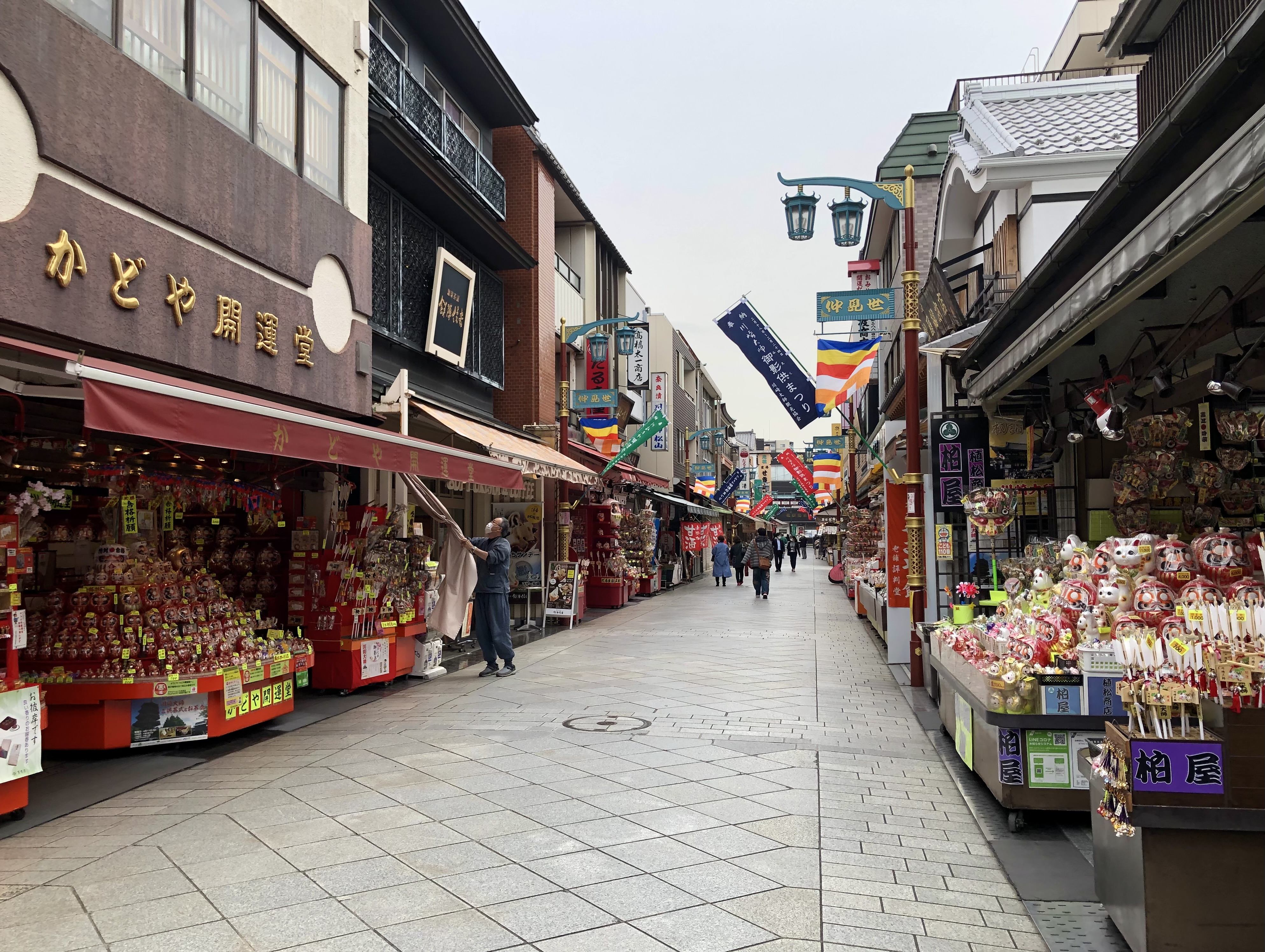 사찰의 대산문(大山門) 앞에 나카미세(仲見世)라는 거리가 있는데, 이렇게 가게들이 늘어서 있다. 길조를 의미하는 물건들은 판매한다고 하는데 길거리 음식도 있고, 기념품 사기도 좋다. 특히 가와사키 대사의 명물인 발효 떡 쿠즈모찌(久寿餅)로 유명한 스미요시(住吉, 공홈)라는 가게 본점이 위치해 있다.