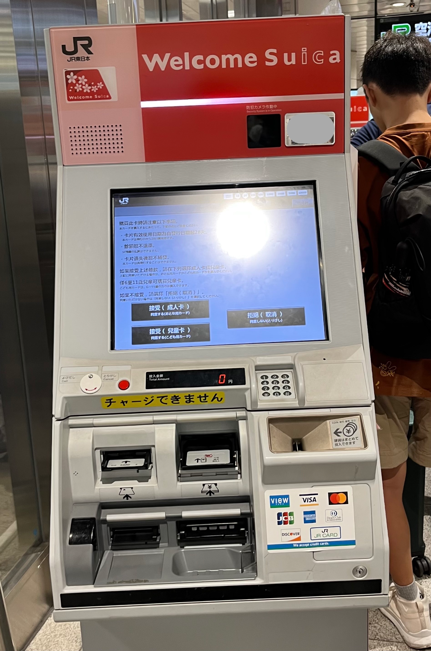 Welcome Suica 전용 발매기는 이렇게 생겼다. 사진은 나리타 공항 제2터미널 JR 개찰구 앞쪽에 있는 발급 기계인데, 여기는 발급 기계가 2개 있었다. 의아했던 점은 구간 티켓(킷부)을 판매하는 기계에는 사람이 터져나가는데, Welcome Suica 발매기에는 사람이 몇 없었다는 점.