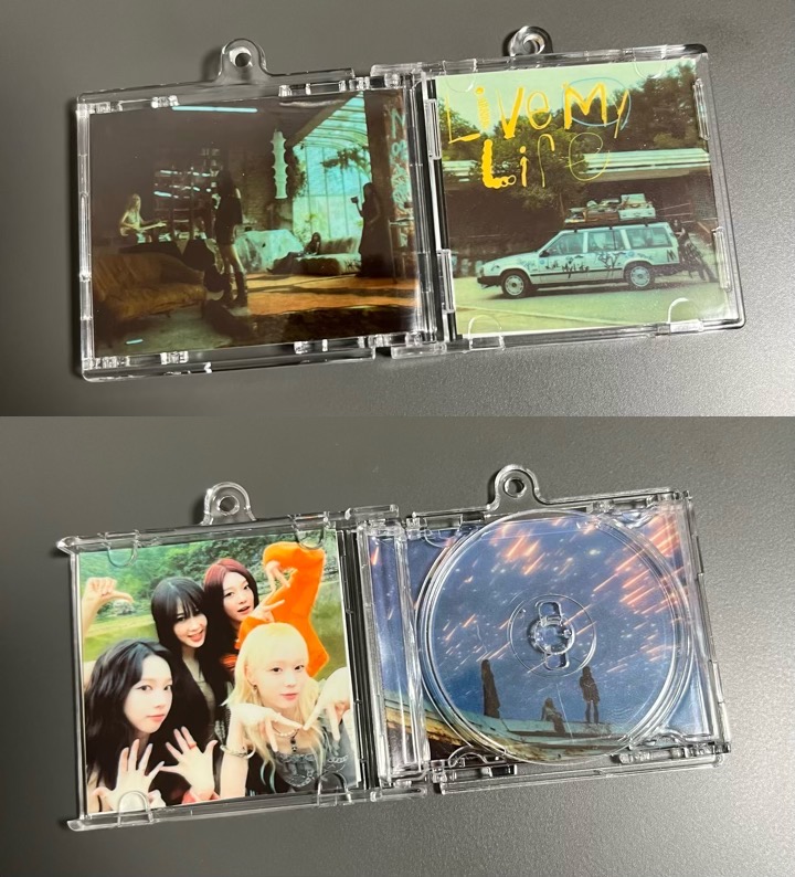 NFC 스티커는 안 보이게 케이스 안쪽에 끼워두건, 리얼하게 CD에 붙이건 어쨌든 안쪽에 위치시켜두기만 하면 된다. 앨범에 핸드폰 뒤통수를 가져다 대면 애플뮤직으로 Live my life가 재생되는 멋진 키링이 완성.