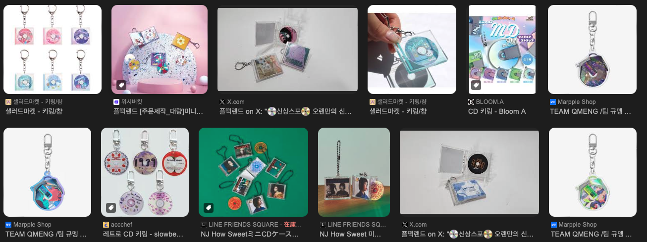 먼저 미니 CD 케이스 키링 세트는 알리에서 이런 걸 구매했다. 가격은 하나에 200엔 정도. 케이스는 가로 5cm 세로 4cm이고, CD 모형은 지름 4cm 사이즈였다. 내가 산 제품은 CD 모형에 보호필름까지 붙어와서 좋았다.