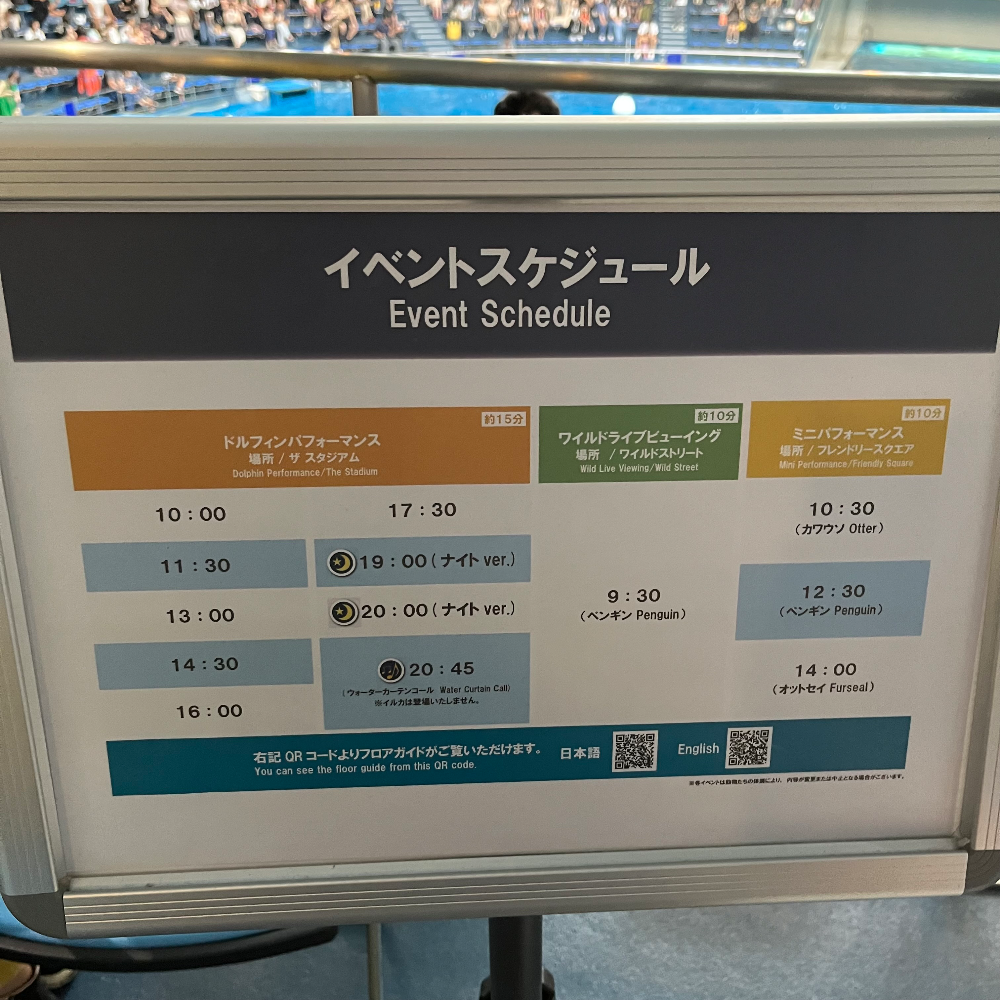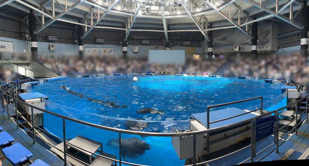 야외 광장을 지나 스타다움으로 들어가면 사람들이 빽빽하게 들어차 있다. 돌고래 공연은 1시간 30분 간격으로 15분간 이루어진다. 1~3열은 물이 엄청나게 튀니까 주의하라면서 우비 착용을 권장하더라. 우비는 11번 입구 근천에서 200엔 (현금만 가능)에 판매한다.