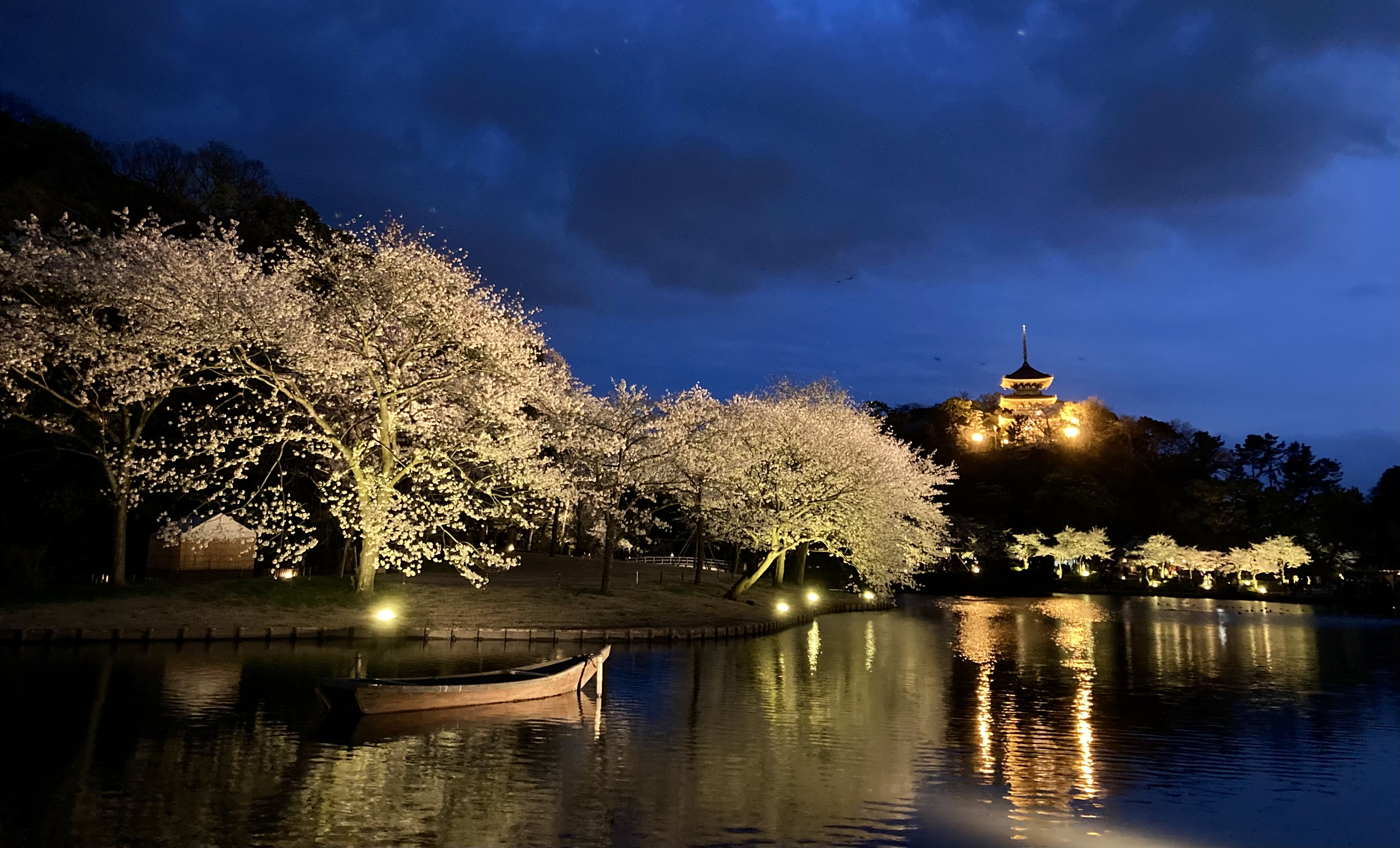 산케이엔은 밤 벚꽃 (夜桜) 풍경으로 유명하다. 해질 때쯤에는 이곳에 사람이 하나둘씩 모여서 나중에는 발 디딜 틈이 없어진다. 전문적인 사진을 찍는 사람들도 많이 오기 때문에, 강가를 따라서 대포 카메라들이 무섭게 늘어선 광경을 볼 수 있다. 일본은 부유한 노년층이 많아서 그런지 취미로 사진을 찍은 어르신들도 많아서, 대포 카메라들을 설치한 사람들을 보면 대부분 할아버지들이다. 이 날도 할아버지들이 많이 계셨는데, 삼각대에 엄청 무겁고 비싸 보이는 카메라를 설치하고 사진을 찍고 계셨다. 나도 그 옆에서 폰으로 열심히 사진을 찍고 있었는데 내가 찍은 거 보시더니 잘 찍었네~~ 해주셨다. ㅋㅋㅋㅋㅋㅋㅋ 그런 카메라 들고 그런 빈 말을 해주시다니... 감사합니다.
